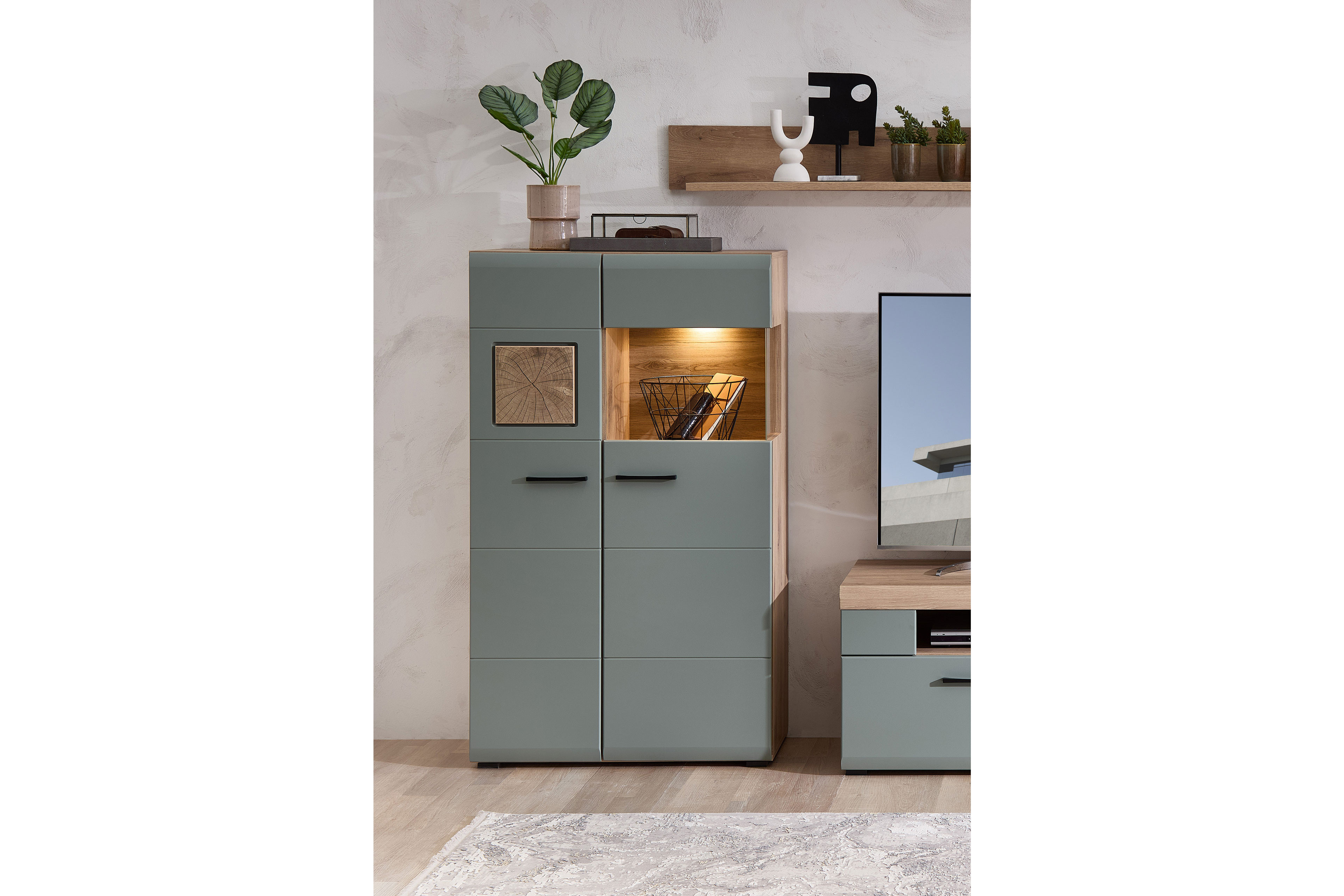 Wohl kaum eine Vitrine setzt so ein Statement wie diese aus der Modellreihe Fun Plus II von Innostyle. Hier wird ansprechendes Design großgeschrieben. Die Front präsentiert sich in reizvollem Schilfgrün, welche durch ihre matte Oberfläche eine zeitlose Eleganz ausstrahlt. Diese dezente Farbwahl des Solisten erzeugt eine beruhigende Atmosphäre und erstrahlt in jedem Raum. Der Korpus erstrahlt in Viking Oak. Diese Ausführung verleiht diesem Möbelstück eine warme und natürliche Ausstrahlung. Diese besondere Holzoptik vermittelt ein Gefühl von Gemütlichkeit und Natürlichkeit in Ihrem Wohnraum. Ein markantes Detail stellt die Absetzung in modernem Hirnholz dar. Es setzt einen schönen Akzent und verleiht diesem Element eine individuelle Note. Diese Vitrine bietet Ihnen viel Staufläche hinter einer Holztür und einer Glas-/ Holztür, was eine flexible Präsentation Ihrer Gegenstände ermöglicht. Die Holztür verleiht der Vitrine einen geschlossenen und eleganten Charakter, während die Glasfront einen transparenten Einblick ermöglicht. Mit der integrierten Beleuchtung setzen Sie Ihre ausgestellten Objekte gekonnt in Szene und schaffen eine stimmungsvolle Atmosphäre im Raum. Vervollständigen Sie Ihre Auswahl mit weiteren faszinierenden Möbeln aus der Fun Plus II Modellreihe – für detaillierte Informationen laden wir Sie herzlich ein, einen Blick in unseren beigefügten Typenplan zu werfen.