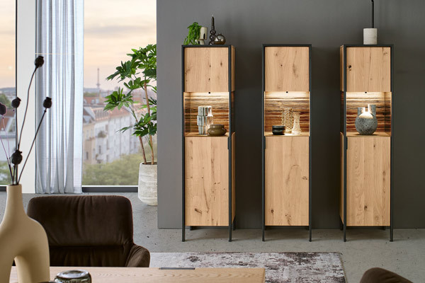 Einen gelungenen Kompromiss zwischen geschlossenen und transparenten Elementen stellen die Vitrinen dar, bei denen die Glasscheiben in unterschiedlichem Verhältnis durch Holz oder auch Metall ergänzt werden. Als Wohnzimmerschränke machen die Glasausschnitte der Vitrinen nur noch weniger als die Hälfte der Front aus. Die restlichen Fächer sind von edlem Holz bedeckt und bieten Ihnen eine flexible Nutzbarkeit für Geschirr, Tischdecken oder auch Bücher und Bastelutensilien. Für kleinere Gegenstände, wie Teelichter oder Batterien, eignen sich außerdem Vitrinen mit Schubladen. Die Fläche hinter dem Glas wird teilweise noch einmal besonders in Szene gesetzt, wenn etwa Baumscheiben oder Holzpaneele die rustikale Rückwand zieren. Die möglichen Maße für Standvitrinen reichen von weniger als 60 cm Breite bis hin zu über 200 cm bei majestätischen Vitrinenschränken. Hinsichtlich der Höhe haben Sie die Wahl zwischen niedrigen Vitrinen, die an ein modernes Sideboard erinnern, sowie hohen Schränken, die den Stauraum nach oben hin ausnutzen. Teilverglaste Modelle finden Sie zudem als unbeschwerte Hängevitrinen.