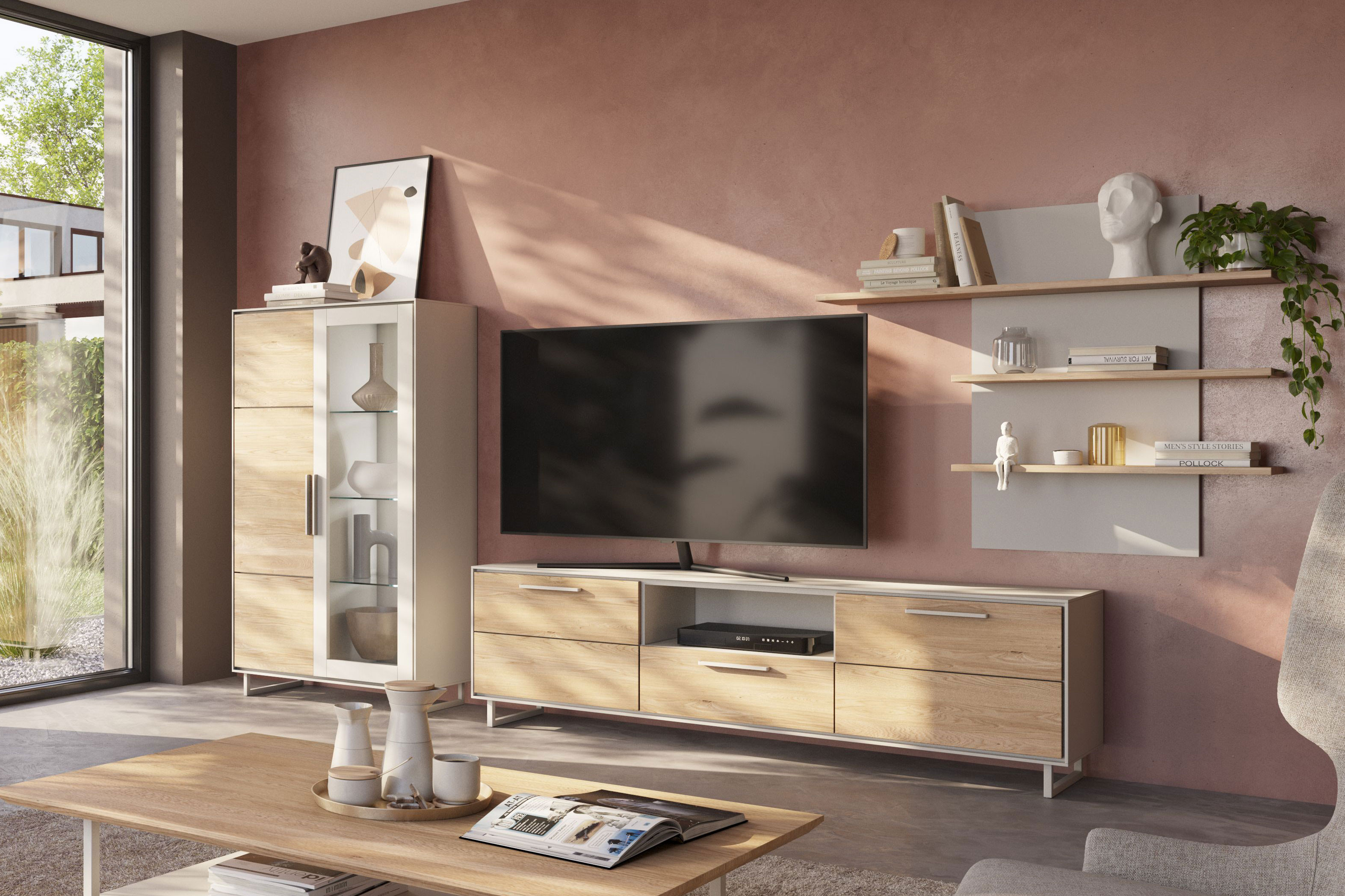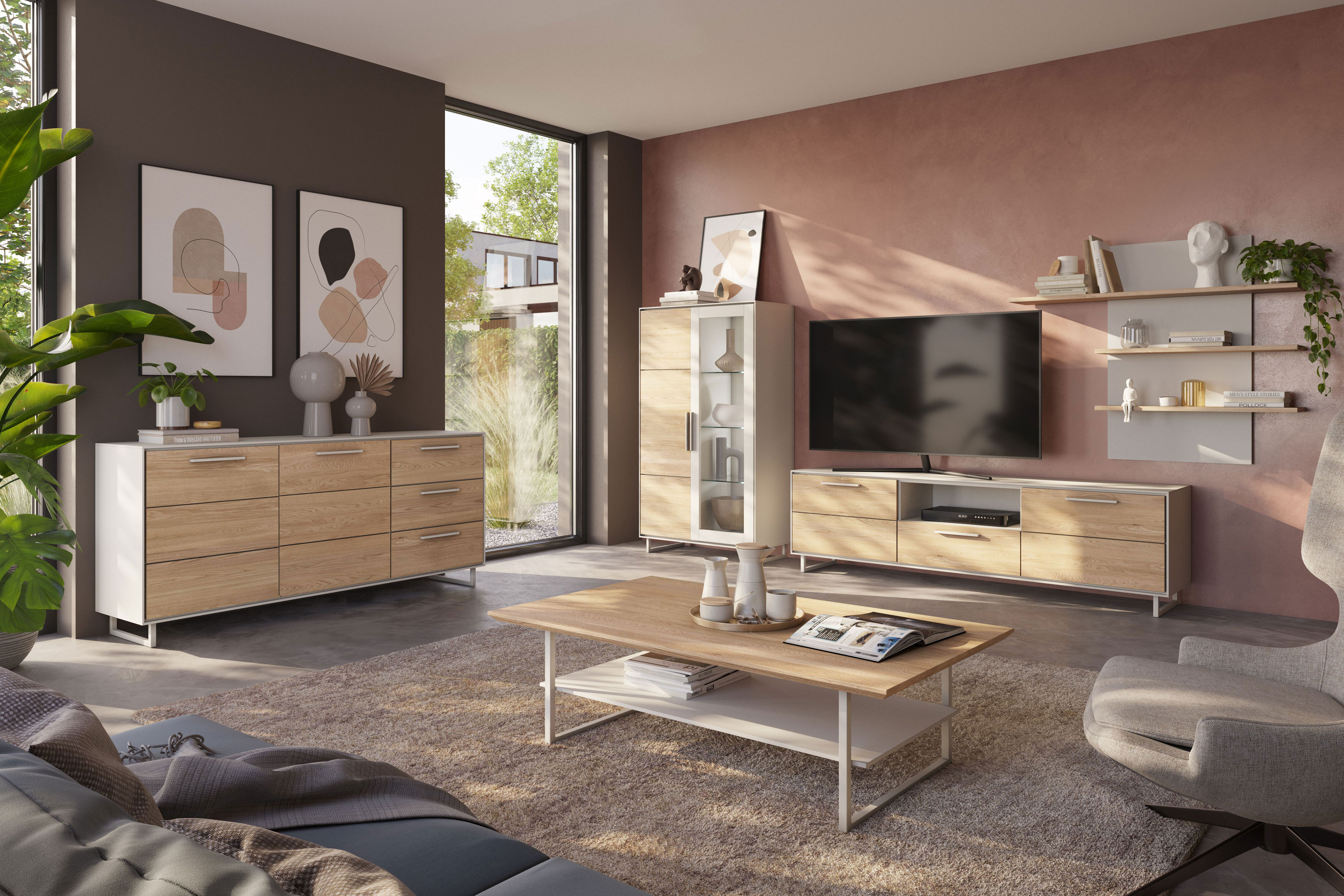 Elfo Möbel schafft mit den Möbeln aus der Modellreihe Kai ein harmonisches Wohnkonzept. Die Wohnwand aus der Kollektion kombiniert eine präzise Verarbeitung und ein modernes Design zu einem stilvollen, funktionalen Ensemble. Die kreidefarbenen Korpusse von Highboard und Lowboard verleiht dem dreiteiligen Set eine ruhige und zeitgemäße Optik. Die Massivholzfronten aus Eiche soegen für einen besonderen Blickfang. Die weiß-grauen Metallfüße unterstreichen die Stabilität der beiden Standmöbel. Des Weiteren bietet das Highboard mit einer Glas-/ Holztür, einer Holztür, drei Glas- und drei Holzböden großzügigen Stauraum sowie elegante Präsentationsflächen. Dämpfung an allen Türen und Softclose bei dem Schubkasten sorgen für hohen Bedienkomfort. Das Lowboard ergänzt die Wohnwand mit zwei Holztüren, drei Holzböden, einem Schubkasten und einem offenen Fach – ideal für Multimedia, Dekoration und Alltagsutensilien. Das Wandpaneel vervollständigt das mehrteilige Wohnset. Mit drei Ablageböden erhalten Sie vielfältige Gestaltungsmöglichkeiten für Ihre kostbaren Schätze. Mit weiteren Einzelmöbeln, welche Sie nicht nur in der Rubrik „Alle Artikel aus der Serie Kai“ finden, sondern auch im hinterlegten Möbelplaner, kreieren Sie sich individuelle Zusammensstellung zugeschnitten auf Ihre Räumlichkeiten.