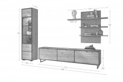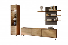 Modell Rosa – wenn Wohnen zur Haltung wird. Die Wohnwand von Elfo Möbel ist kein gewöhnliches Möbelensemble. Sie ist stilvolles Statement für Menschen mit Sinn für Ästhetik, Materialität und Atmosphäre. Hier verschmelzen Echtholzfurnier, Massivholz und moderne Akzente zu einem Wohnkonzept, das Ruhe ausstrahlt und zugleich Präsenz zeigt. Die grau marmorierten Rückwände der Vitrine und des Wandpaneels setzen bewusste Kontraste und verleihen dem Set eine außergewöhnliche Tiefenwirkung. Die Vitrne wird mit integrierter Beleuchtung, einer Glas-/ Holztür, zwei Glaseinlegeböden und zwei Holzeinlegeböden zur stilvollen Bühne für besondere Stücke. Das Lowboard überzeugt mit klarer Funktionalität: drei Schubkästen und Softclose-Funktionen verbinden Komfort mit Ordnung. Getragen wird das Ensemble von dunkelgrauen Metallfüßen und Metallkufen, die dem Design Leichtigkeit und urbane Eleganz verleihen. Das Wandpaneel mit drei Ablageböden aus furnierter Eiche ergänzt die Wohnwand um eine gestalterische Komponente. Ob als Mittelpunkt im Wohnzimmer oder als bewusst komponierte Kulisse – die Wohnwand schafft ein Ambiente, das bleibt.