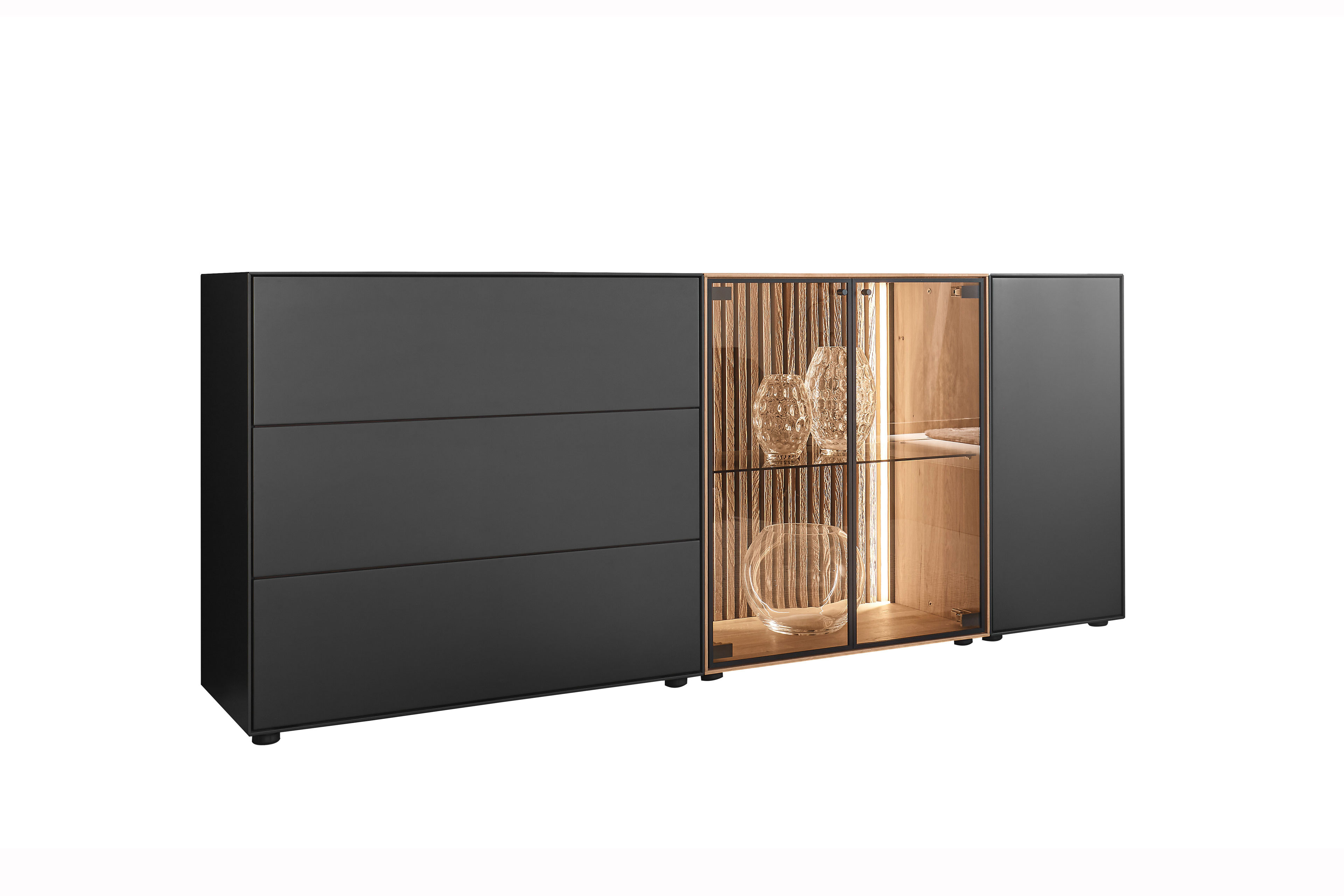 Sideboard mit 2 Glastüren, 1 Holzklappe, 2 Schubkästen, 1 Holztür (rechts), 1 Glasboden, 1 Holzboden und 1 Lamellenrückwand