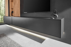Wie Moose und Bäume in einem Wald miteinander verbunden sind und ein harmonisches Ökosystem bilden, so vereinen sich auch in der Modellreihe Selino zwei scheinbar unterschiedliche Materialien zu einer außergewöhnlichen Einheit. Die edlen Oberflächen aus massivem Holz und der raffinierte, matte Lack gehen eine perfekte Symbiose ein – kräftig und natürlich, zugleich zart und elegant. Diese Balance aus Stärke und Feinheit bringt die einzigartige Schönheit der Natur direkt in Ihr Zuhause und verwandelt es in einen Ort der Ruhe und Inspiration. Beispielsweise bietet das zweiteilige Hängelowboard aus massivem Birkenholz, in elegantem Schwarz gebeizt, nicht nur großzügigen Stauraum hinter zwei praktischen Klappen, sondern auch eine klare, schlichte Optik, die jeden Raum aufwertet. Darüber befindet sich ein Hängeschrank aus natürlichem Eichenholz, dessen wunderschöne Lammellentür ein echtes Highlight darstellt und für eine warme, natürliche Ausstrahlung sorgt. Ein daran angelehntes Regal mit einer rustikalen Rückwand aus Riffholz und vier stilvollen Glasböden bringt zusätzliches Flair in Ihr Heim. Es bietet Platz für Ihre liebsten Dekorationsstücke und verstärkt das moderne, luftige Design der Wohnwand. Besonders im Abendlicht entfaltet Selino seine ganze Magie. Optional können Sie die Wohnwand mit bis zu drei stimmungsvollen Beleuchtungseinheiten ausstatten, die die Holzoberflächen und Ihre Einrichtung wunderbar in Szene setzen. Ob einzelne Lichtquellen oder eine vollständige Beleuchtung – Sie haben die Wahl, das perfekte Ambiente für Ihr Zuhause zu kreieren. Verwöhnen Sie sich und Ihr Zuhause mit diesem einzigartigen Design aus dem Hause Hartmann.