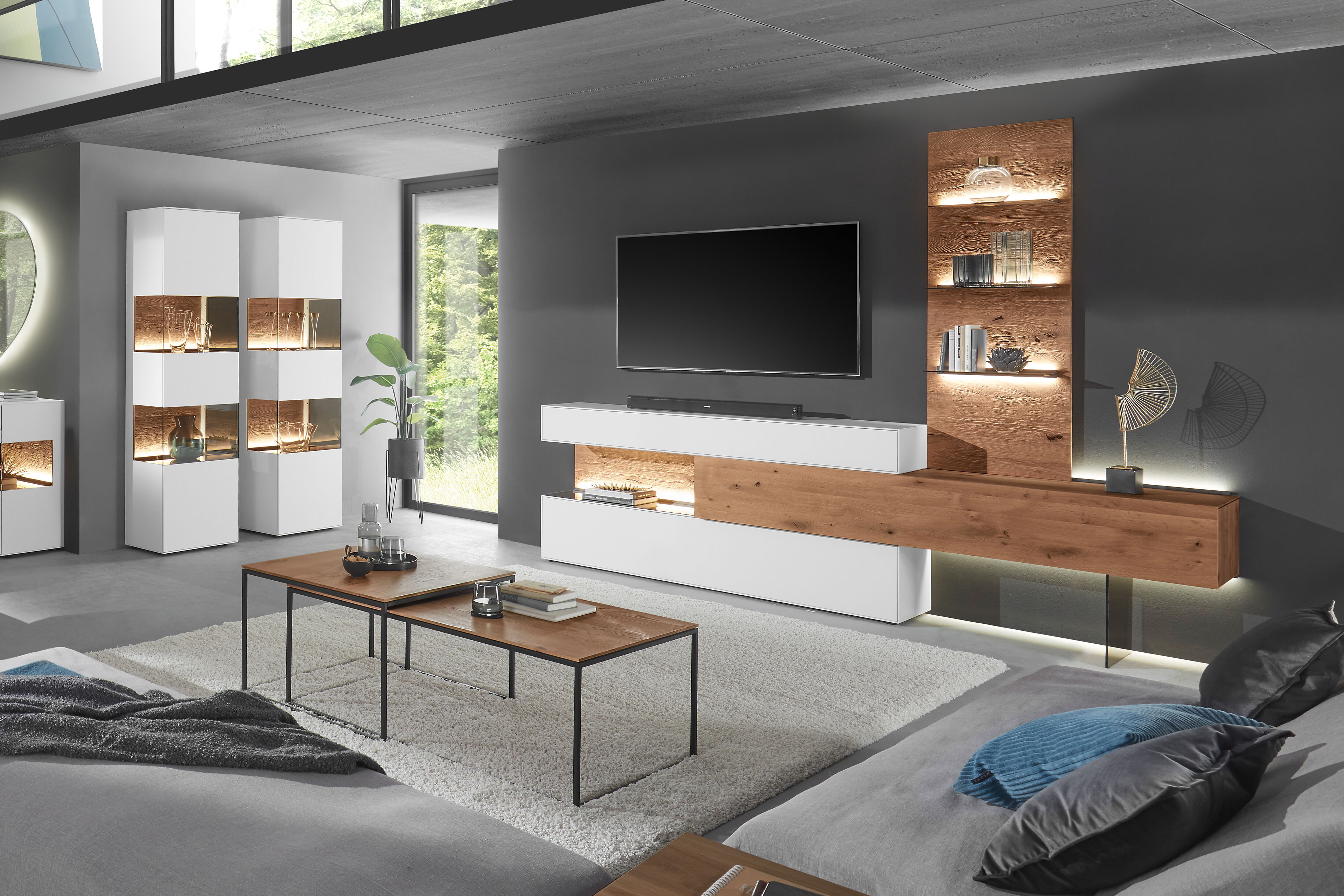 Wohnwand V22 von Hartmann - Modell Torido Lack weiß/ Kerneiche/ inklusive Glasstütze Torido - edle Oberfläche, massives Herz, zeitlose Stärke