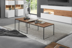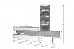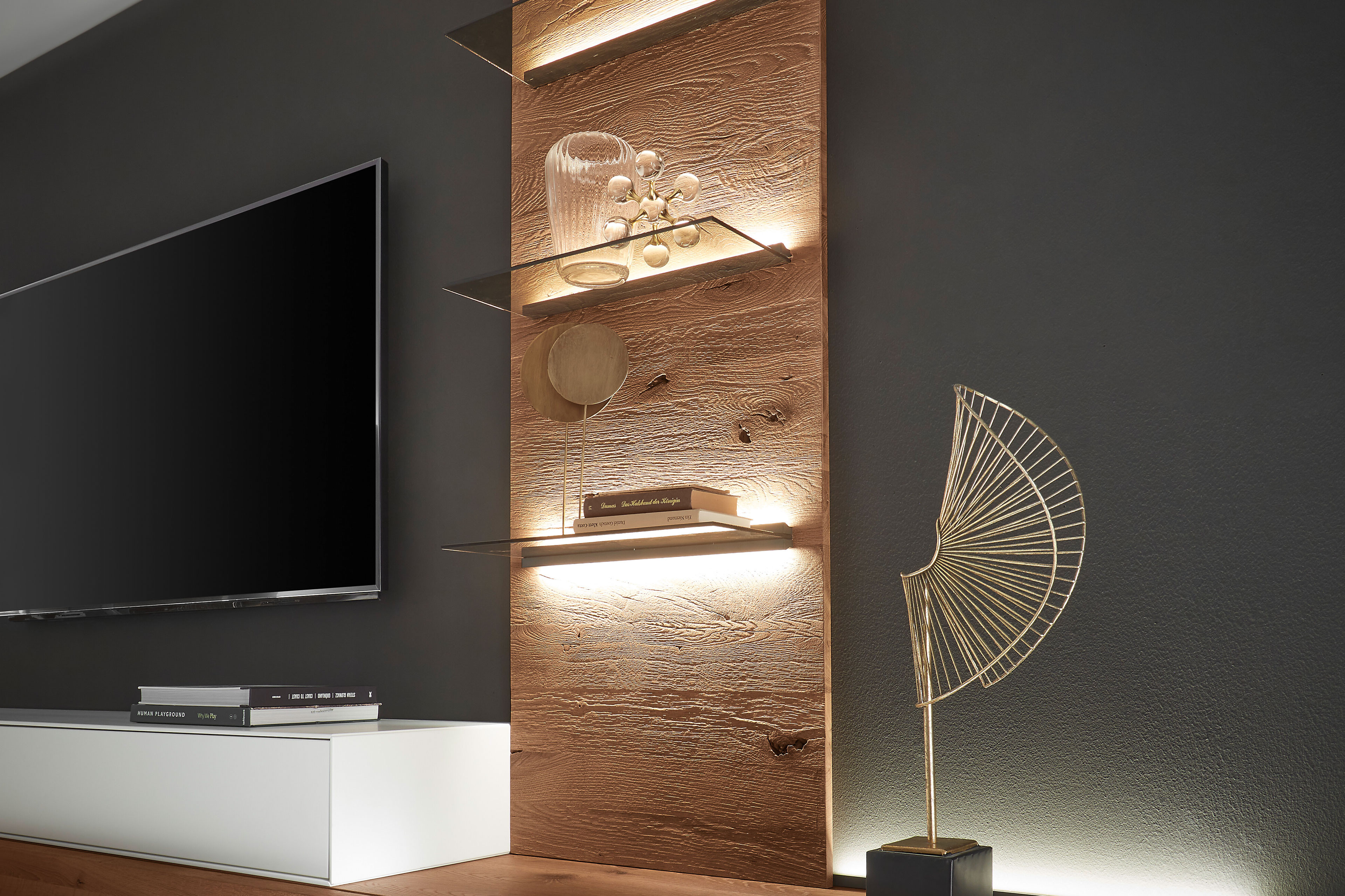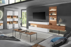Dieses Wohnensemble aus der Modellreihe Torido von Hartmann begeistert mit einer gekonnten Symbiose aus natürlicher Holzstruktur, weiß lackierten Elementen und eleganten Glasböden. Hier verschmelzen warme Ausstrahlung und zeitgemäßes Design zu einem harmonischen Gesamtbild, das Wohnräume in stilvolle Wohlfühlorte verwandelt. Im Mittelpunkt steht das großzügige Wandpaneel, das nicht nur optisch beeindruckt, sondern auch viel Raum für Dekoration mit persönlicher Note bietet. Ob ausgewählte Lieblingsstücke, Bilder oder Pflanzen – hier entsteht Ihre ganz individuelle Wohnbühne. Die Kombination aus klaren Linien und natürlicher Maserung schafft dabei eine Atmosphäre von Leichtigkeit und Eleganz. Eine besondere Raffinesse ist die Sichtrückwand mit dazugehörigem Spiegelboden, der auf dem Lowboard darunter platziert wird. Dieses durchdachte Detail sorgt für faszinierende Tiefe und reflektiert Ausstellungsstücke sowie Licht auf elegante Weise. Optionale Beleuchtungen setzen die Struktur des Holzes zusätzlich in Szene, während die Glasböden stimmungsvolle Lichtspiele erzeugen und dem Ensemble eine edle Transparenz verleihen. Mit dem Modell Torido holen Sie sich nicht nur ein hochwertiges Massivholzmöbel ins Haus, sondern ein Wohngefühl voller Ruhe und Geborgenheit. Ein Ort zum Entspannen und zum Energie tanken – Tag für Tag.