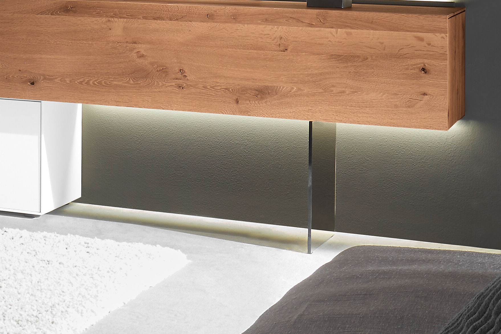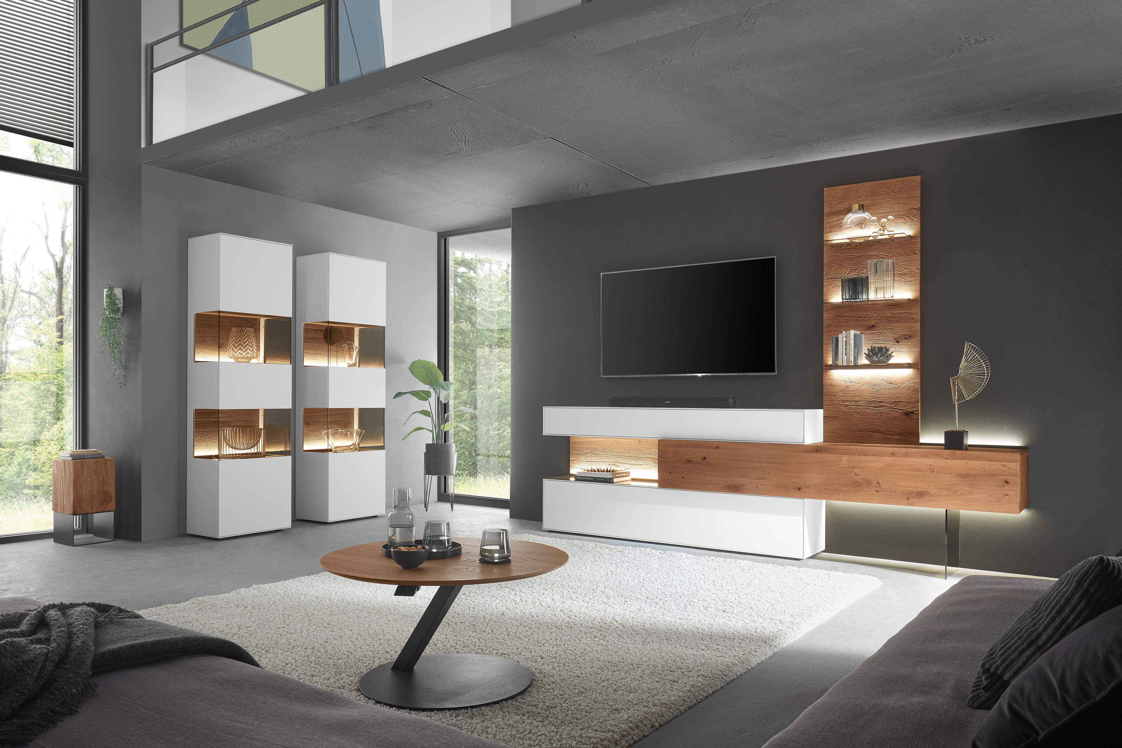 Dieses Wohnensemble aus der Modellreihe Torido von Hartmann begeistert mit einer gekonnten Symbiose aus natürlicher Holzstruktur, weiß lackierten Elementen und eleganten Glasböden. Hier verschmelzen warme Ausstrahlung und zeitgemäßes Design zu einem harmonischen Gesamtbild, das Wohnräume in stilvolle Wohlfühlorte verwandelt. Im Mittelpunkt steht das großzügige Wandpaneel, das nicht nur optisch beeindruckt, sondern auch viel Raum für Dekoration mit persönlicher Note bietet. Ob ausgewählte Lieblingsstücke, Bilder oder Pflanzen – hier entsteht Ihre ganz individuelle Wohnbühne. Die Kombination aus klaren Linien und natürlicher Maserung schafft dabei eine Atmosphäre von Leichtigkeit und Eleganz. Eine besondere Raffinesse ist die Sichtrückwand mit dazugehörigem Spiegelboden, der auf dem Lowboard darunter platziert wird. Dieses durchdachte Detail sorgt für faszinierende Tiefe und reflektiert Ausstellungsstücke sowie Licht auf elegante Weise. Optionale Beleuchtungen setzen die Struktur des Holzes zusätzlich in Szene, während die Glasböden stimmungsvolle Lichtspiele erzeugen und dem Ensemble eine edle Transparenz verleihen. Mit dem Modell Torido holen Sie sich nicht nur ein hochwertiges Massivholzmöbel ins Haus, sondern ein Wohngefühl voller Ruhe und Geborgenheit. Ein Ort zum Entspannen und zum Energie tanken – Tag für Tag.