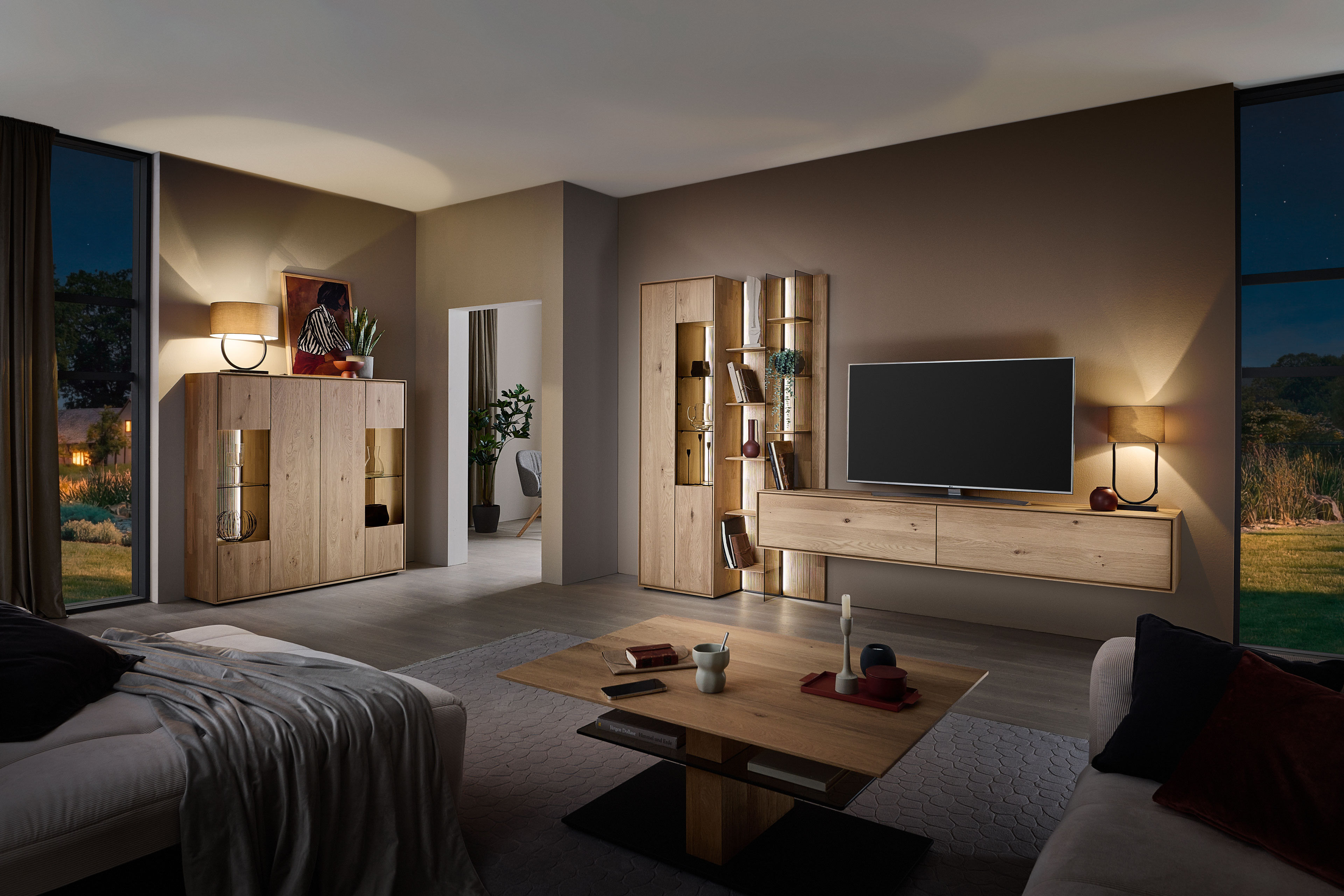 Ein Wohnraum ist mehr als nur ein Ort zum Leben – er ist Ausdruck von Persönlichkeit, Stil und Atmosphäre. Ein harmonisch gestaltetes Wohnensemble wie beispielsweise das hier abgebildete von Hartmann verbindet Funktionalität mit Ästhetik und schafft einen Mittelpunkt, an dem Design und Wohnlichkeit aufeinandertreffen. Das Herzstück der Wohnwand aus der Modellreihe Vala-living bildet ein markantes Wandpaneel aus Kerneiche mit geschroppter Rückwand. Die lebendige Struktur des Massivholzes verleiht dem Raum Wärme und eine besondere Wertigkeit. Links schmiegt sich eine elegante Vitrine an das Paneel an, während rechts ein Hängelowboard teilweise in das Paneel hineinragt. Durch dieses raffinierte Zusammenspiel entsteht eine spannende 3D-Optik, die dem Möbel eine moderne, architektonische Tiefe verleiht. Stauraum und Präsentationsfläche stehen dabei in perfektem Einklang: Persönliche Lieblingsstücke, Gläser oder dekorative Objekte lassen sich stilvoll in Szene setzen, während gleichzeitig praktischer Platz für Ihre Alltagsgegenstände entsteht. Die Trennwände des Regals sowie die Glasböden aus edlem Parsolglas bilden einen eleganten Kontrast zum kraftvollen Massivholz der Kerneiche und unterstreichen die hochwertige Gestaltung. Die optional buchbare Beleuchtung rundet das Ensemble ab und setzt Materialien, Holzstrukturen und Lieblingsstücke stimmungsvoll in Szene. So entsteht ein Wohnbereich, der nicht nur funktional überzeugt, sondern vor allem eines schafft: eine Oase zum Wohlfühlen.