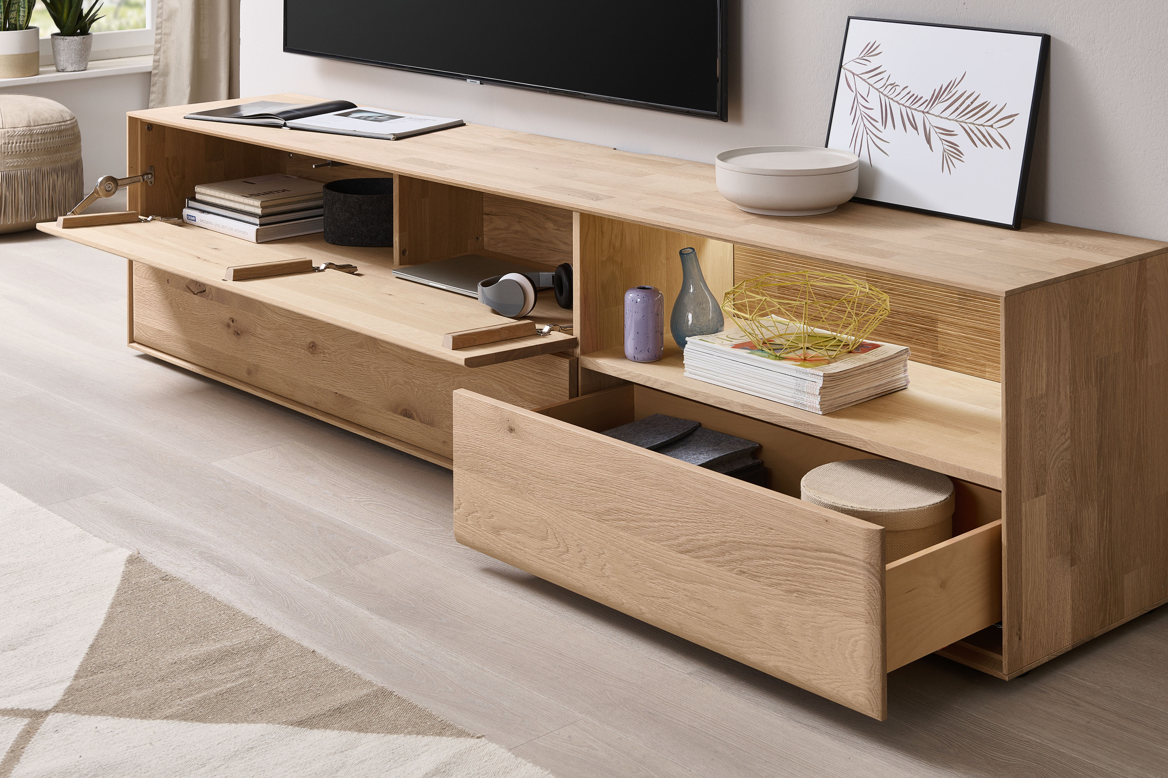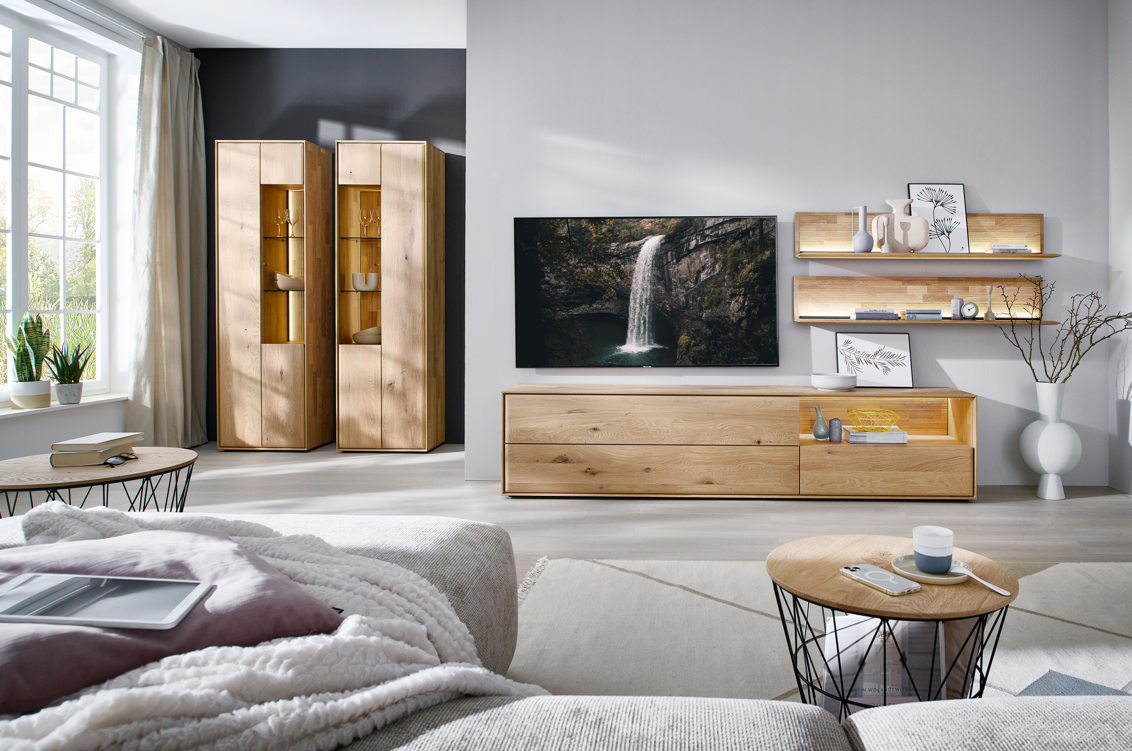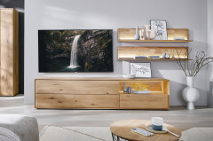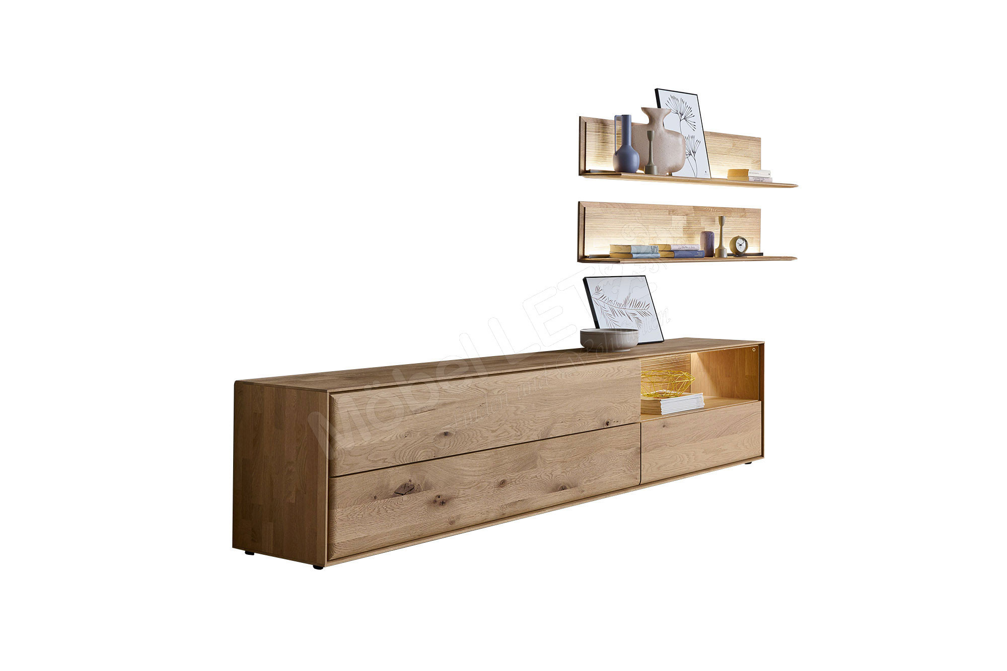Stilvoll. Funktional. Individuell – Ihre neue Wohnkombination aus Massivholz von Hartmann. Diese verbindet zeitloses Design mit durchdachter Funktionalität. Das Lowboard aus hochwertigem Eichenholz bietet mit einer Klappe, zwei Schubkästen, einem offenen Fach und einer praktischen Kabelbürste optimalen Stauraum für TV-Geräte, Multimedia-Zubehör und persönliche Lieblingsstücke. Besonders praktisch: Das offene Fach ist optional beleuchtbar und setzt Ihre Geräte oder dekorativen Elemente stimmungsvoll in Szene. Abgerundet wird das Ensemble durch zwei elegante Wandboards mit jeweils ca. 154 cm Breite. Sie bieten zusätzlichen Platz für Dekoration, Bücher oder persönliche Highlights und lassen sich dank der buchbaren Beleuchtung perfekt in Szene setzen. Die Kombination aus natürlichem Massivholz, klaren Linien und warmem Licht schafft eine harmonische, wohnliche Atmosphäre. Planen Sie Ihre Wunschkombination ganz einfach mit dem Furnplan-Programm und unserer Hotline – so entsteht ein maßgeschneidertes Wohnensemble, das genau zu Ihrem Stil und Ihren Bedürfnissen passt. Modell Vala – eine exzellente Wahl für Ihren neuen Wohn(t)raum.