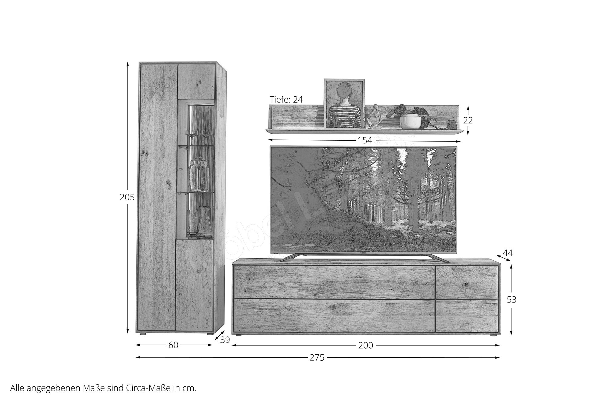 Die Lebensgeschichte eines Baumes wird durch typische Wuchsmerkmale wie Zeichnung, Struktur und Farbe geprägt, denn kein Baum gleicht dem anderen. Deshalb kann es bei der Verwendung von Echtholz zu Farb- und Strukturdifferenzen bei den einzelnen Möbelstücken kommen. Bei Echtholz sprechen diese naturbedingten Eigenschaften für die Einzigartigkeit des Holzes. Dies ist kein Grund für eine Reklamation oder Beanstandung.