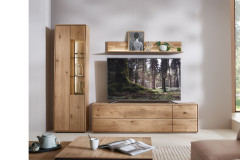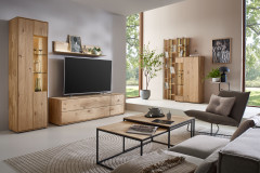 Hartmann steht als traditionsreicher Hersteller für Möbel mit Erfahrung, Qualität und einem feinen Gespür für Design. Die Verarbeitung von hochwertigem Massivholz – insbesondere charaktervoller Kerneiche – spiegelt die Leidenschaft für natürliche Materialien und präzises Handwerk wider. So entstehen langlebige Möbelstücke, die Wärme ausstrahlen und jedem Wohnraum eine besondere Note verleihen. Die kompakte Wohnkombination aus der Modellreihe Vala erweist sich dabei als echter Glücksgriff in Form und Gestaltung. Sie vereint stilvolle Optik mit durchdachter Funktionalität und bietet überraschend viel Stauraum auf überschaubarem Raum. Hinter den Fronten aus Kerneiche lassen sich Alltagsgegenstände ordentlich und griffbereit verstauen, während die klare Linienführung für ein ruhiges Gesamtbild sorgt. Gleichzeitig eröffnet die Kombination vielfältige Möglichkeiten zur Präsentation: Auf dem Ablageboden des Wandboards finden dekorative Elemente ihren Platz, während der Glaseinsatz mit zwei Glasböden eine elegante Bühne für besondere Lieblingsstücke schafft. Die geschroppte Rückwand hinter dem Glas sowie die Paneelrückwand setzen dabei markante, natürliche Akzente und unterstreichen den einzigartigen Charakter des Massivholzes. Eine optional erhältliche Beleuchtung rundet das Ensemble stimmungsvoll ab, indem sie die Strukturen des Holzes und die ausgestellten Objekte sanft hervorhebt. So entsteht eine Wohnlösung, die nicht nur funktional überzeugt, sondern auch mit ihrer harmonischen Ausstrahlung begeistert – kompakt, hochwertig und bis ins Detail durchdacht.
