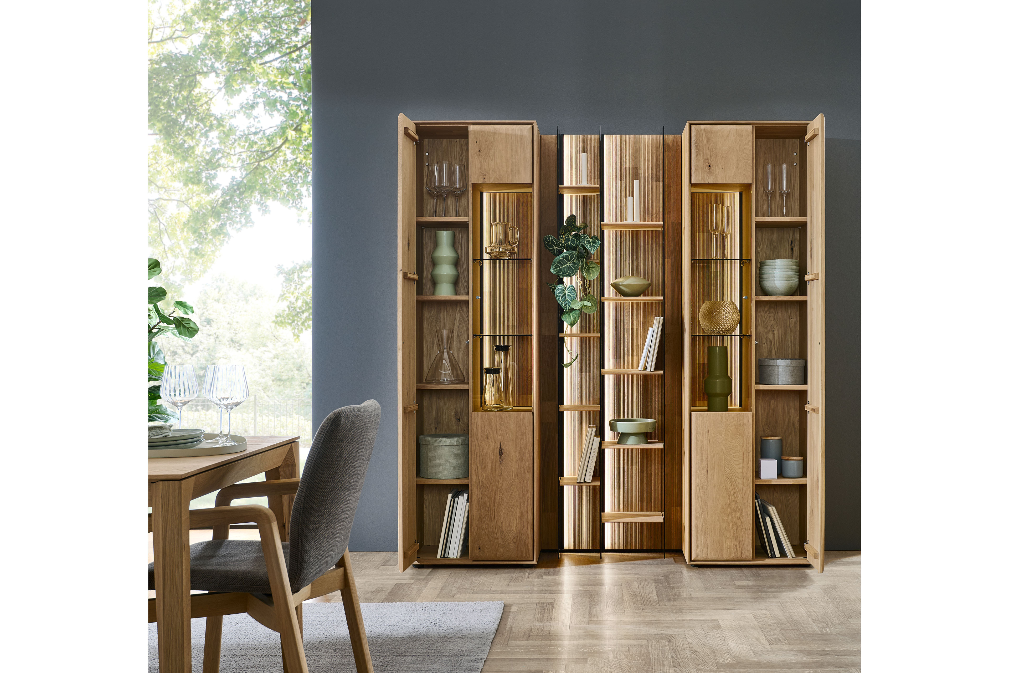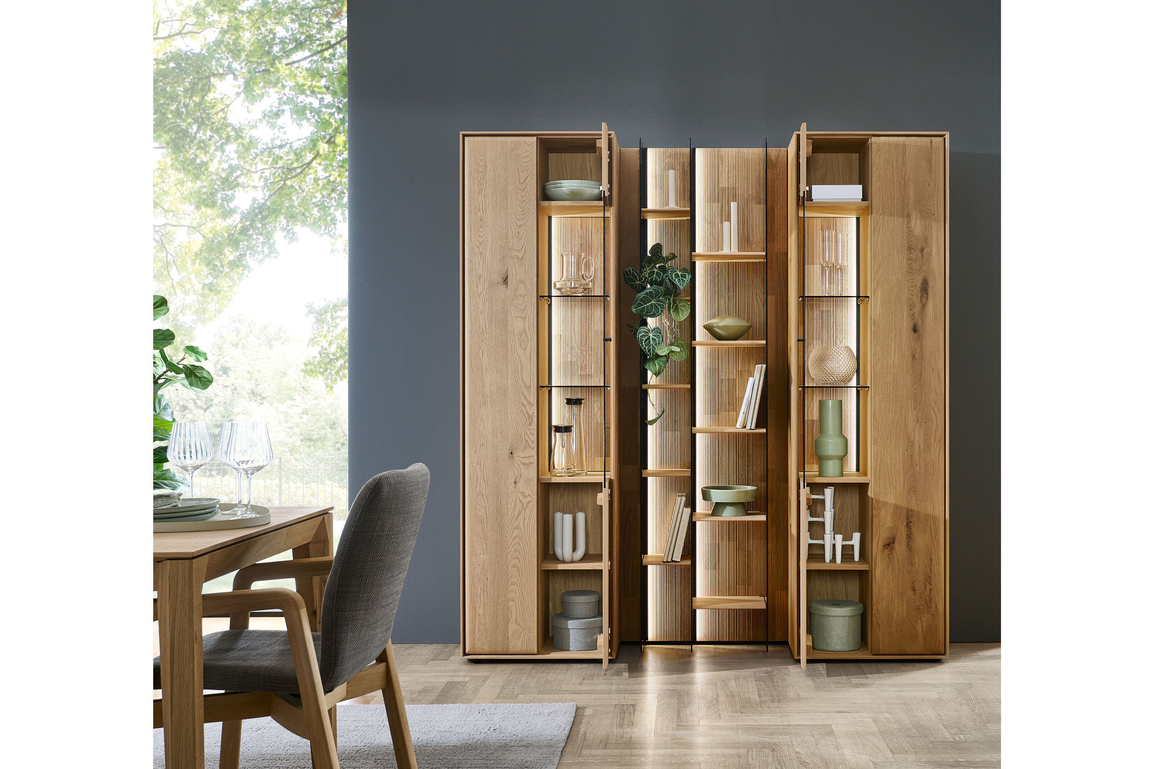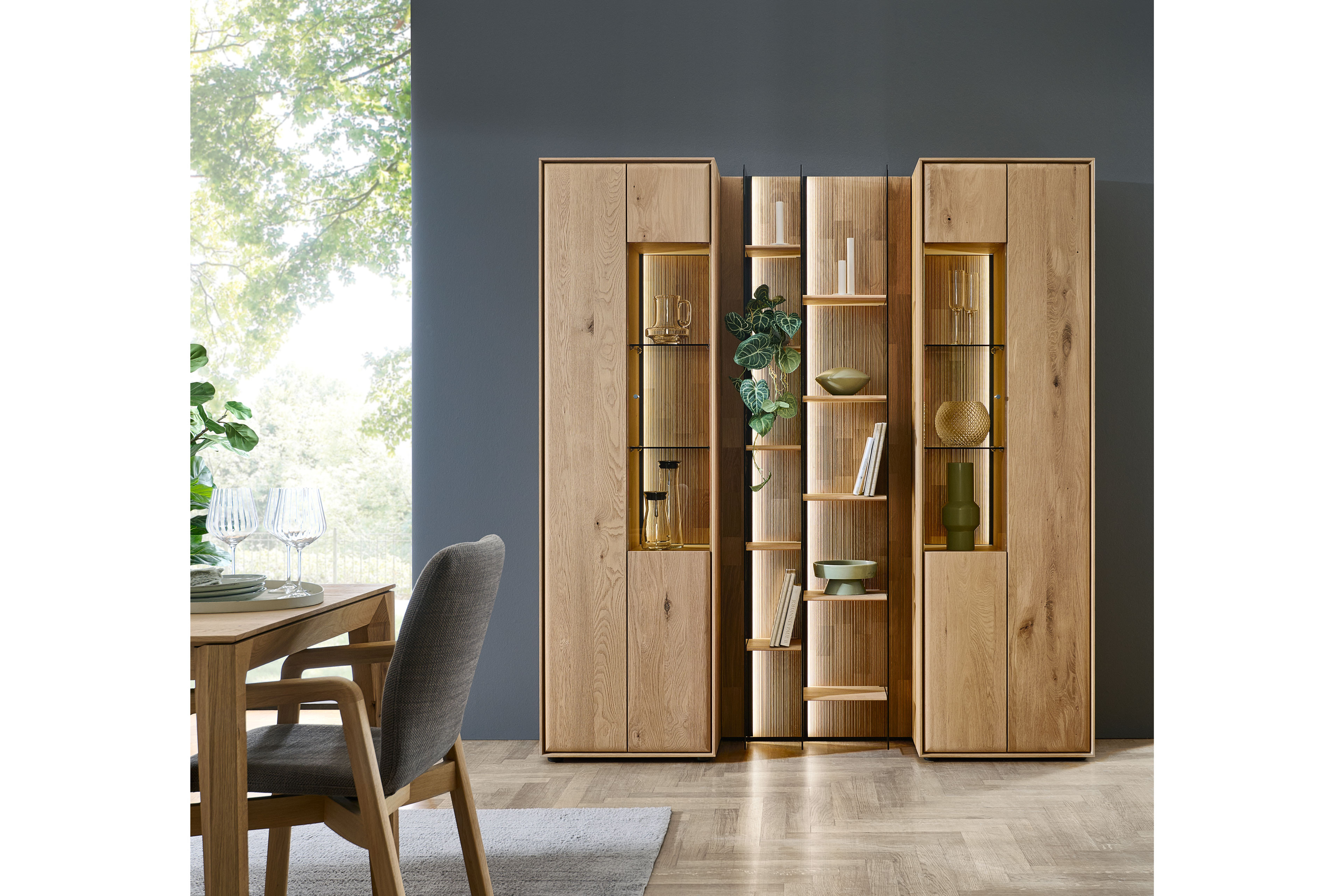 Dieses eindrucksvolle Wohnensemble aus der Modellreihe Vala vereint hochwertige Materialien mit moderner Gestaltung und wird zum stilvollen Mittelpunkt Ihres Wohnraums. Im Zentrum steht ein markantes Wandpaneel aus Massivholz, dessen geschroppte Rückwand mit ihrer lebendigen Struktur sofort ins Auge fällt und dem Raum eine warme, natürliche Ausstrahlung verleiht. Das Paneel überzeugt nicht nur optisch, sondern auch funktional: Drei elegante Glasseiten sorgen für eine leichte, offene Wirkung, während zehn Regalböden aus Holz großzügigen Platz für Bücher, Dekoration und persönliche Lieblingsstücke bieten. So entsteht eine perfekte Balance zwischen Staufläche und stilvoller Präsentation. Eingerahmt wird das Modul von zwei hochwertigen Vitrinen, die mit jeweils einem Glasausschnitt ausgestattet sind. Sie bieten zusätzlichen Stauraum und setzen ausgewählte Objekte gekonnt in Szene. Wählen Sie optional ihre Wunschbeleuchtung hinzu, welche dem Ensemble eine besondere Tiefe verleiht und für eine stimmungsvolle Inszenierung von Holzstrukturen und Dekoration sorgt. Komfortdetails wie integrierte Dämpfungen und Möbelgleiter garantieren eine angenehme Handhabung sowie einen sicheren Stand. Gleichzeitig ermöglicht die Kombination aus Paneel und Vitrinen eine flexible Gestaltung, die sich harmonisch in unterschiedliche Wohnkonzepte einfügt. Gefertigt in hochwertiger Qualität „Made in Germany“ steht Hartmann für langlebige Möbel mit Charakter – natürlich, zeitlos und mit viel Liebe zum Detail.