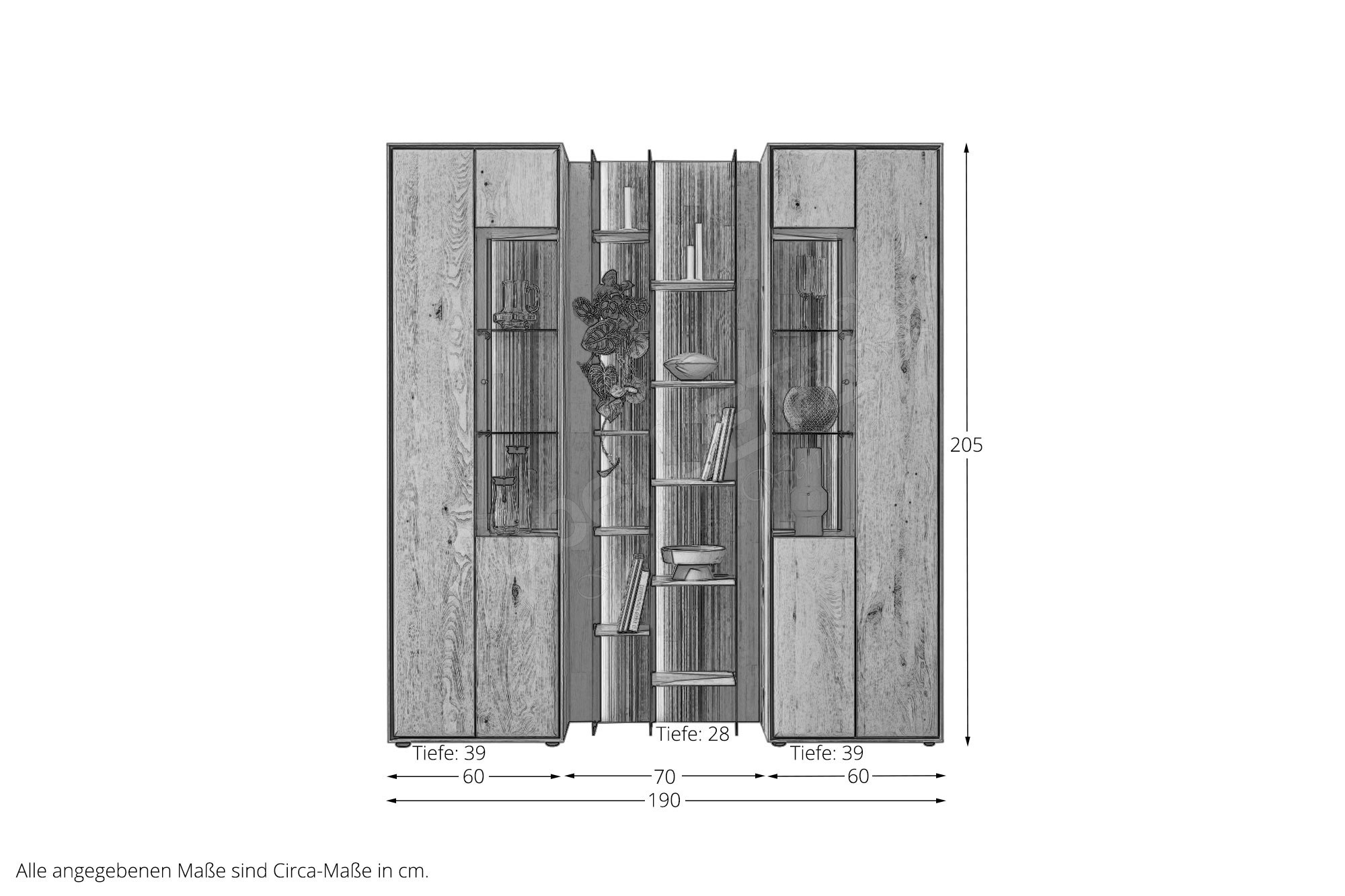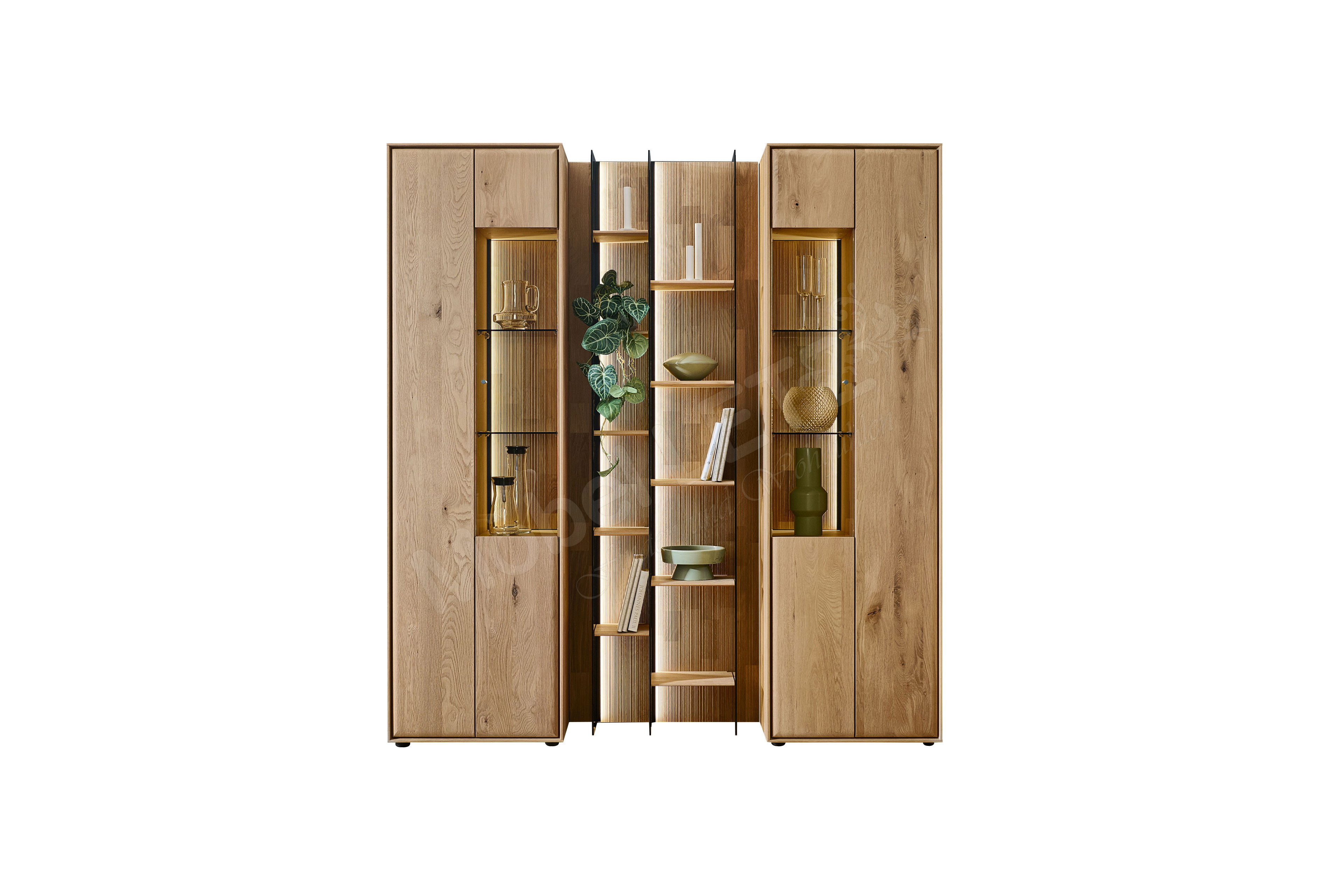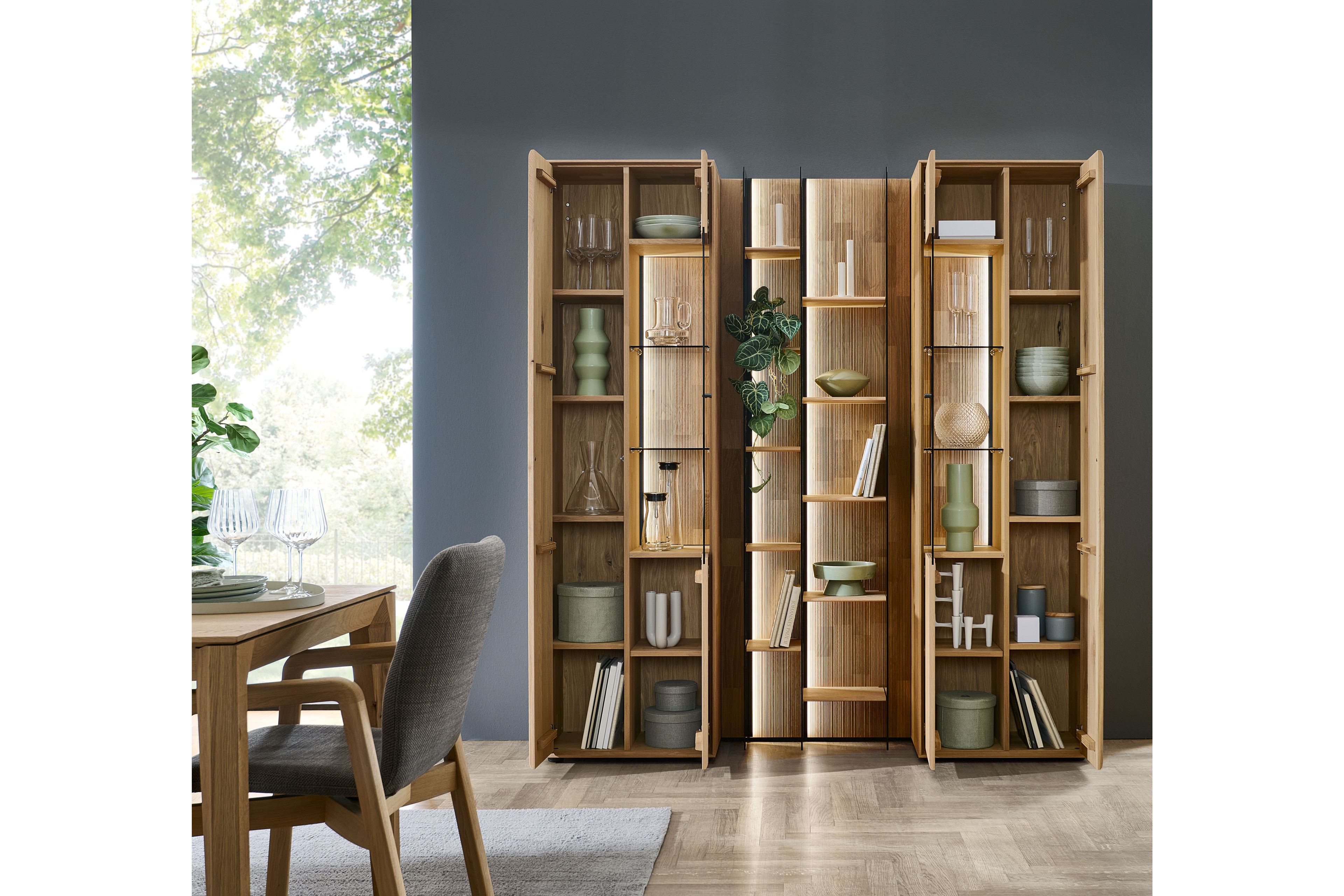 Dieses eindrucksvolle Wohnensemble aus der Modellreihe Vala vereint hochwertige Materialien mit moderner Gestaltung und wird zum stilvollen Mittelpunkt Ihres Wohnraums. Im Zentrum steht ein markantes Wandpaneel aus Massivholz, dessen geschroppte Rückwand mit ihrer lebendigen Struktur sofort ins Auge fällt und dem Raum eine warme, natürliche Ausstrahlung verleiht. Das Paneel überzeugt nicht nur optisch, sondern auch funktional: Drei elegante Glasseiten sorgen für eine leichte, offene Wirkung, während zehn Regalböden aus Holz großzügigen Platz für Bücher, Dekoration und persönliche Lieblingsstücke bieten. So entsteht eine perfekte Balance zwischen Staufläche und stilvoller Präsentation. Eingerahmt wird das Modul von zwei hochwertigen Vitrinen, die mit jeweils einem Glasausschnitt ausgestattet sind. Sie bieten zusätzlichen Stauraum und setzen ausgewählte Objekte gekonnt in Szene. Wählen Sie optional ihre Wunschbeleuchtung hinzu, welche dem Ensemble eine besondere Tiefe verleiht und für eine stimmungsvolle Inszenierung von Holzstrukturen und Dekoration sorgt. Komfortdetails wie integrierte Dämpfungen und Möbelgleiter garantieren eine angenehme Handhabung sowie einen sicheren Stand. Gleichzeitig ermöglicht die Kombination aus Paneel und Vitrinen eine flexible Gestaltung, die sich harmonisch in unterschiedliche Wohnkonzepte einfügt. Gefertigt in hochwertiger Qualität „Made in Germany“ steht Hartmann für langlebige Möbel mit Charakter – natürlich, zeitlos und mit viel Liebe zum Detail.