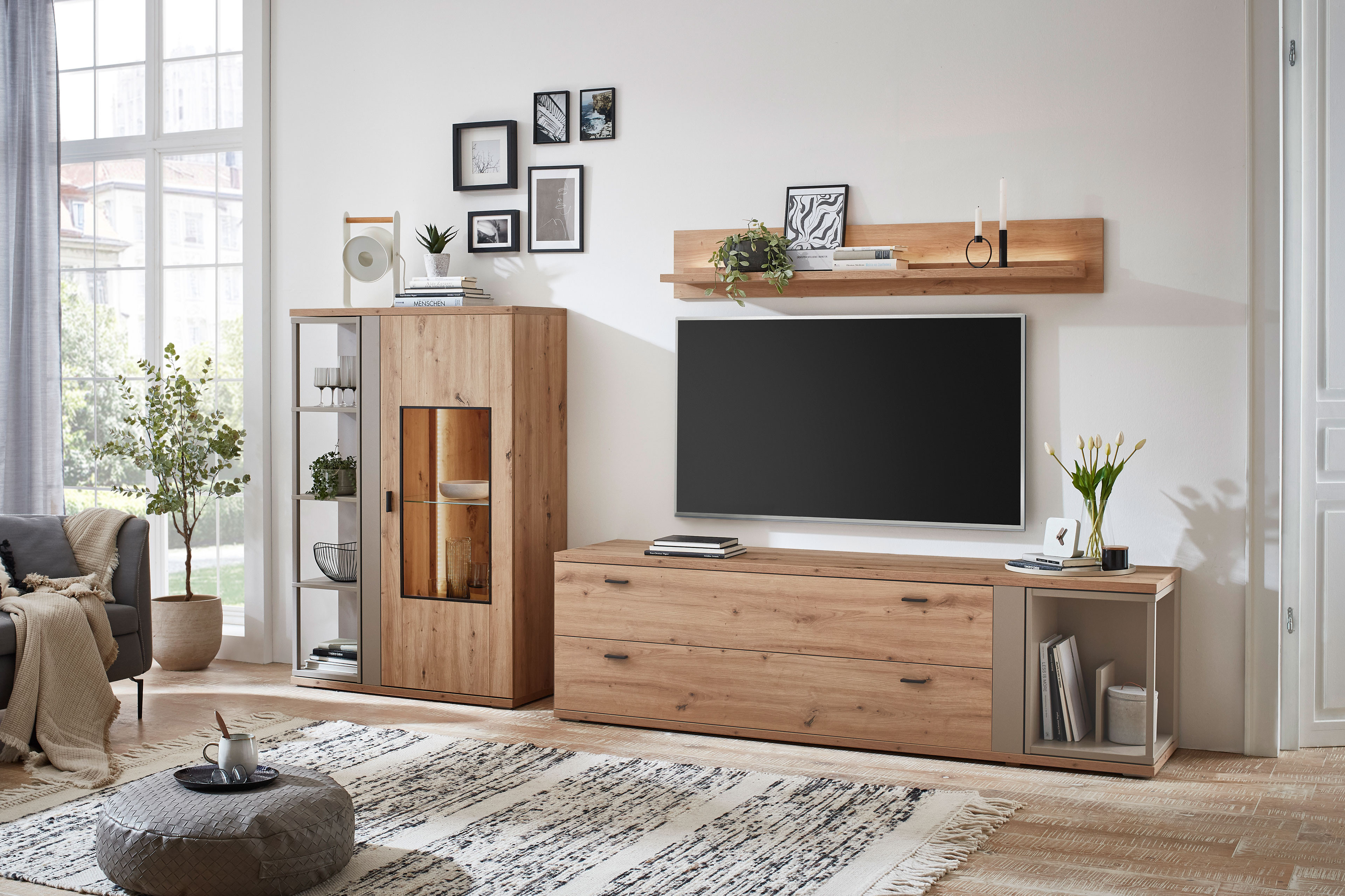 Stauraum mit Pfiff und eine Wohnwand mit Charme – das bekommen Sie mit dem Modell Grado-living von IDEAL Möbel. Das in Eiche gehaltene Trio begeistert mit eleganten Absetzungen in Basalt, welche insbesondere die praktischen Drehregale im High- und Lowboard betonen. Diese lassen sich vollkommen versteckt, halb offen oder ganz geöffnet präsentieren. Im Highboard bekommen Sie auf vier Ebenen Platz, um kleine Dinge auszustellen oder Ihre Bücher ansprechend zu verstauen. Auch hinter dem Glasausschnitt kommen Fotos, Vasen oder andere liebgewonnene Stücke besonders zur Geltung. Mit einer hinzubuchbaren Beleuchtung schaffen Sie eine gemütliche Atmosphäre in Ihrem Wohnraum, wobei das Wandboard mit einer ergänzenden Illumination ebenso helfen kann. Das TV-Unterteil bietet Platz für Ihren Fernseher sowie sämtliches Zubehör in den beiden Doppelschubkästen. Für physische Medien eignet sich das kleine Drehregal an der Seite optimal. Grado-living von IDEAL ist ein Wohnset mit Stil für Ihr Zuhause.