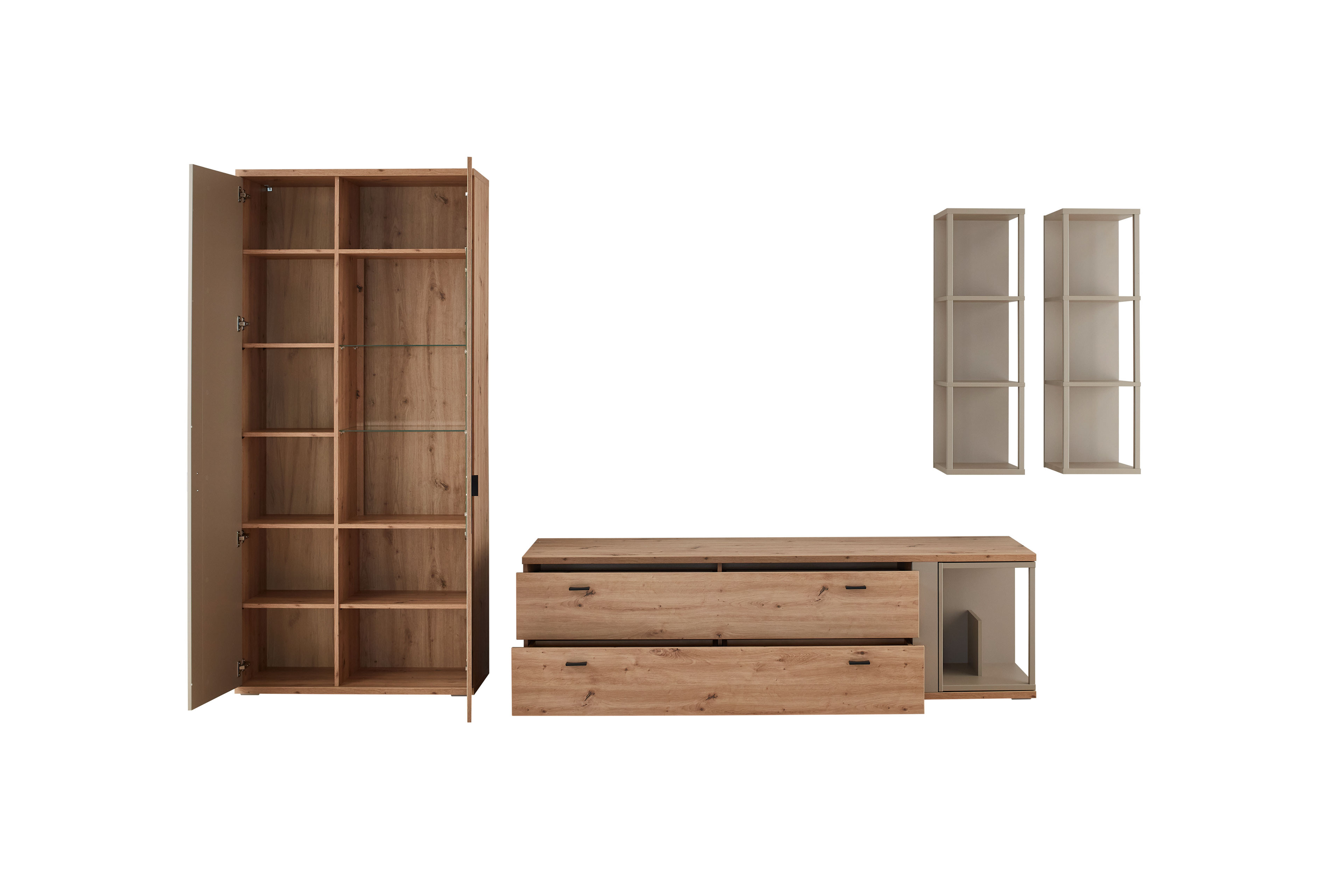Wohnwände sind meist die imposantesten Objekte in einem Wohnzimmer, doch sie müssen nicht aufdringlich sein. Entdecken Sie dieses Ensemble aus der Modellreihe Grado-living von IDEAL Möbel in Eiche Artisan und Basalt. Eine großzügige Vitrine mit einer Holz- und einer Glas-/ Holztür bieten auf insgesamt zehn Böden viel Platz zum Verräumen und auch Ausstellen. Mit einer optionalen Beleuchtung, welche die beiden Glasböden besonders hervorhebt, akzentuieren Sie nicht nur die platzierten Stücke, sondern kreieren in Ihrem Wohnraum ein gemütliches Ambiente. Das Lowboard glänzt mit einer großen Abstellfläche sowie zwei praktischen Doppelschubkästen mit viel Platz für Kleinigkeiten wie Kabel, Batterien und mediales Zubehör. Der Clou ist das seitliche Drehregal mit einem senkrechten Teiler, in dem Blu-rays und Bücher bequem Platz finden. Drehen Sie es, wie Sie möchten – die 360-Grad-Drehung macht es möglich. Abgerundet wird das Set von zwei identischen Wandregalen in Basalt mit jeweils drei offenen Fächern. Bücher, Pflanzen und Dekoration bringen Leben in Ihre vier Wände. Grado-living von IDEAL Möbel – für jeden genau das Richtige.