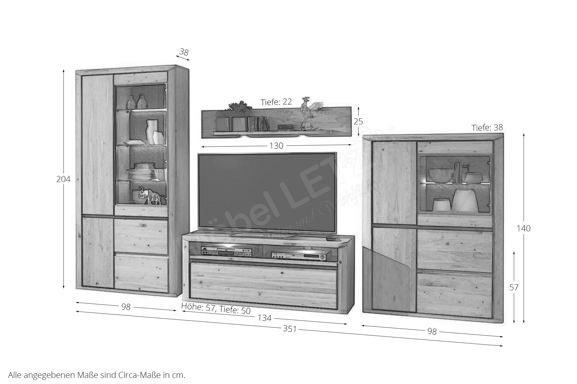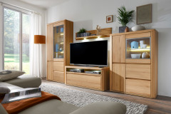 Die sowohl schlichte als auch zeitlose Wohnwand-Serie Korsika von IDEAL Möbel zeigt sich in massiver, geölter und folierter Kernbuche und mit Absetzungen in Schiefer. Durch diesen Materialmix entsteht ein einzigartiges Wohnbild, welches zum Wohlfühlen und Verweilen einlädt. Dieses Angebot umfasst eine Vitrine, ein TV-Unterteil, ein Wandboard und ein Highboard. Sie erhalten unzählige Möglichkeiten, alltägliche Dinge außer Sichtweite abzulegen oder aber besondere Stücke zur Schau zu stellen. Die optionale LED-Glaskantenbeleuchtung betont Ihre platzierten Dekorationen, wie Sammler- oder Lieblingsstücke und rückt diese effektvoll in Szene. Unser Möbelplaner hält alle Elemente des Typenplanes zur freien Planung für Sie bereit. Kreieren Sie so ganz einfach Ihre individuelle Wunschzusammenstellung, welche Sie hier angepasst an Ihre räumlichen Gegebenheiten konfigurieren können.