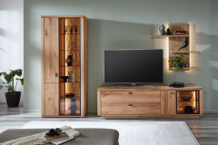 Holen Sie sich einen Hauch spanisches Flair in Ihre vier Wände mit der Wohnwand Malaga aus dem Hause IDEAL Möbel. Eine hohe Vitrine mit einer Holztür und einer Glastür mit Metallrahmen bietet umfangreichen Stauraum auf insgesamt vier Holzböden hinter der Holztür und fünf Glasböden hinter der Glastür. Die Rückwand in einer sandgestrahlten Optik kann durch eine optionale Beleuchtung besonders hervorgehoben werden. Platzieren Sie auf oder über dem Lowboard Ihren Flachbildfernseher und nutzen Sie die beiden großzügigen Doppelschubkästen sowie die beiden Türen für Ihre technischen Geräte und die üblichen Kleinigkeiten, die man im Wohnzimmer gern griffbereit hat. Auch hier besteht die Möglichkeit auf eine hinzubuchbare Beleuchtung. Als Abschluss fungiert das elegante Wandregal mit einem Paneel und drei Ablageböden. Das gesamte Ensemble ist in Eiche Artisan gehalten, was einen natürlichen Flair in Ihren vier Wänden schafft. Holen Sie sich noch heute etwas aus der Serie Malaga nach Hause – sei es diese Wohnwand oder andere Stücke, die Sie sowohl im Typenplan als auch im Möbelkonfigurator finden werden.