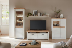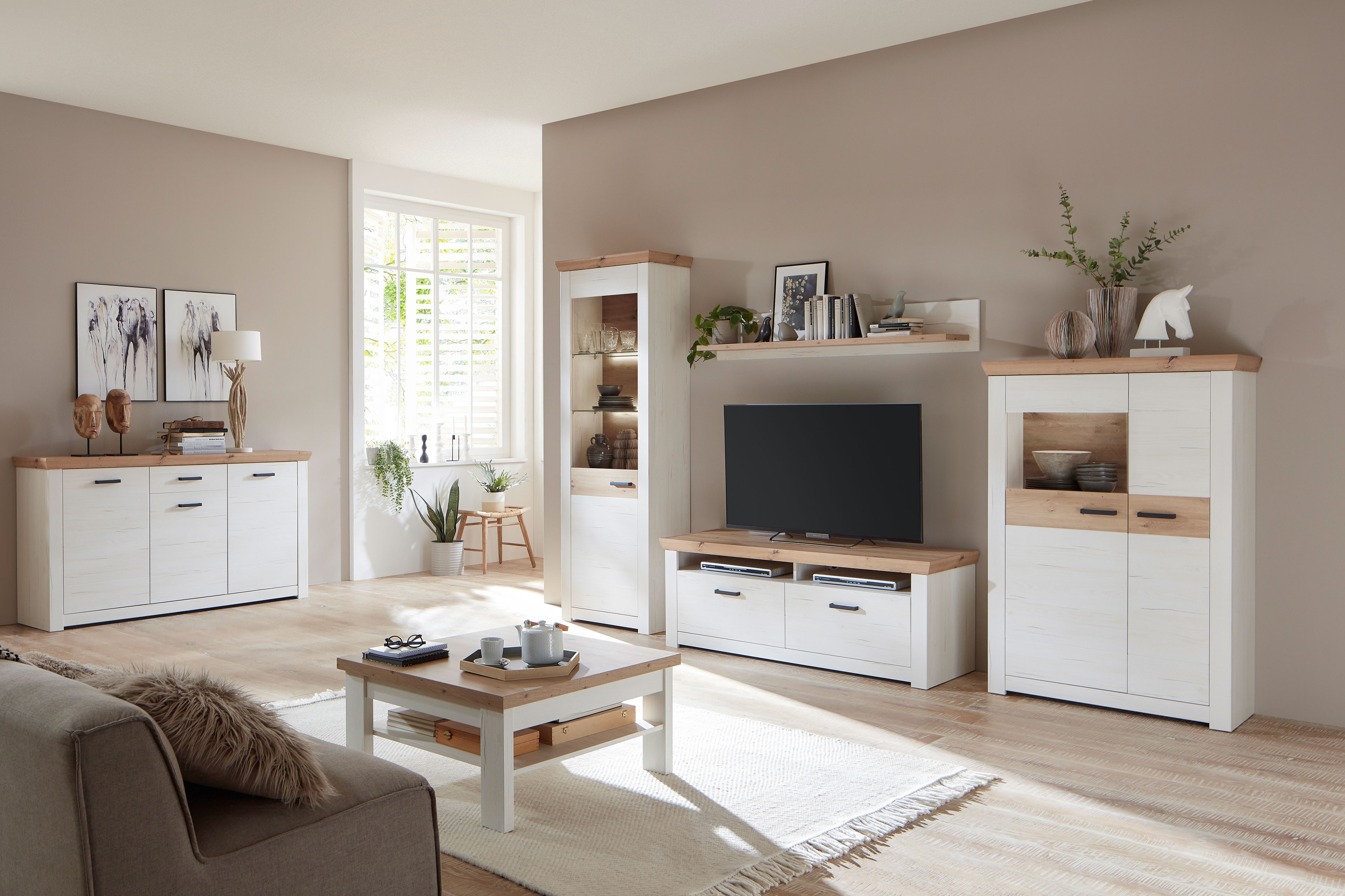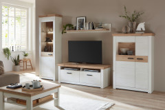 Eine gemütliche Ausstrahlung trifft auf vielseitigen Stauraum – das kennzeichnet die Wohnwand Nizza von IDEAL Möbel. Front und Korpus präsentieren sich in der hellen Ausführung Pino Aurelio, während Abdeckblätter sowie Absetzungen in warmer Eiche Artisan für einen harmonischen Kontrast sorgen. Die hohe Vitrine mit einer Glas-/ Holztür und zwei Glasböden schafft Raum, um Dekorationen stilvoll zu platzieren und Lieblingsstücke gekonnt zu präsentieren. Das Lowboard mit zwei Schubkästen und zwei offenen Fächern bietet Ihrem Fernseher einen passenden Platz und überzeugt zugleich durch praktische Unterbringungsmöglichkeiten. Unterflurführung und Dämpfung machen die Handhabung angenehm und unaufdringlich. Das Highboard mit einer Holztür sowie einer Holz-/ Glastür eröffnet weitere Optionen: dekorativ in Szene setzen oder ordentlich verstauen. Auf dem Oberboden finden saisonale Akzente einen geeigneten Platz. Abgerundet wird das Gesamtbild durch das Wandboard mit Ablageboden über dem TV-Unterteil: ideal für Bücher, Pflanzen oder persönliche Arrangements. Mit Nizza von IDEAL Möbel hält Behaglichkeit Einzug in Ihr Zuhause.