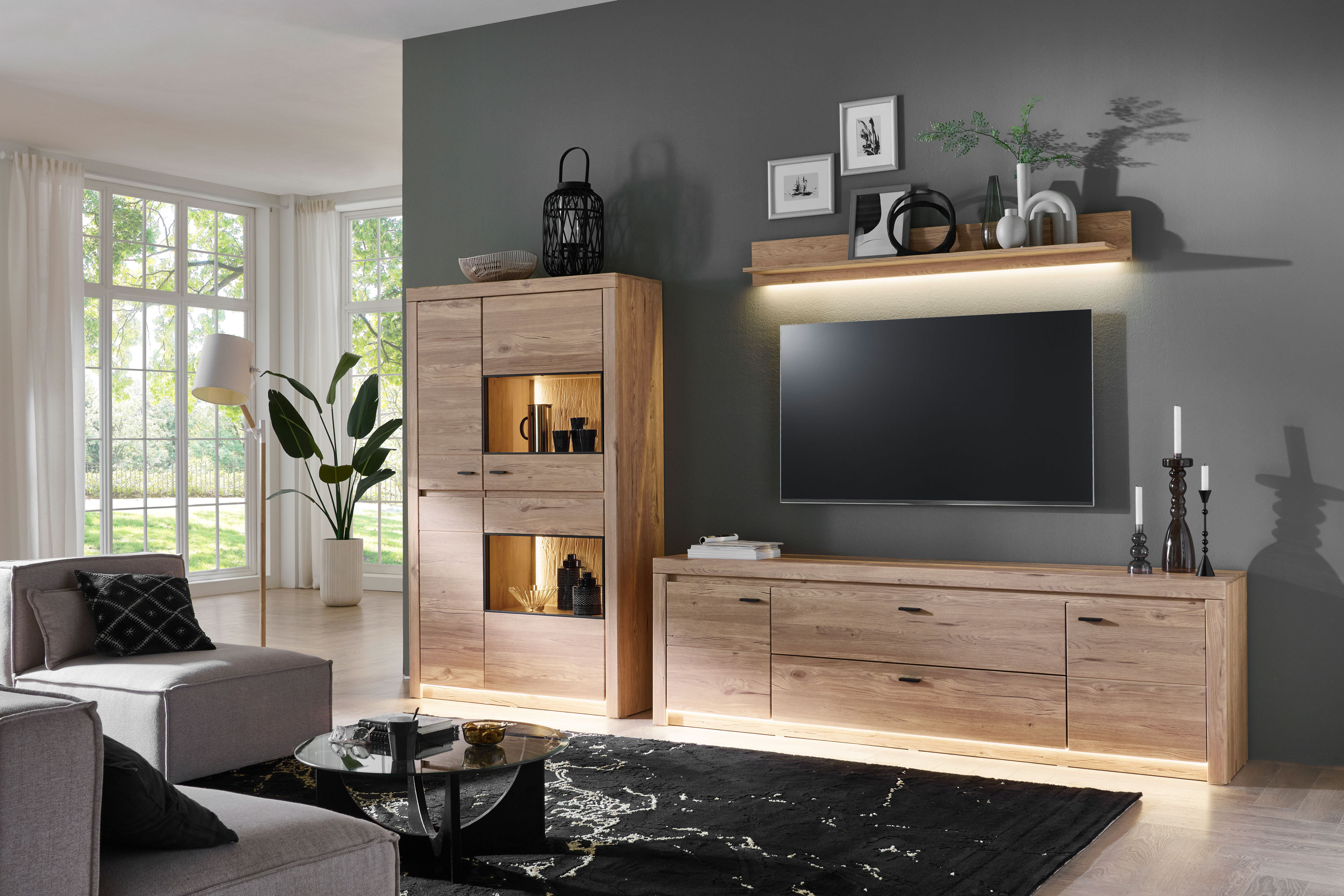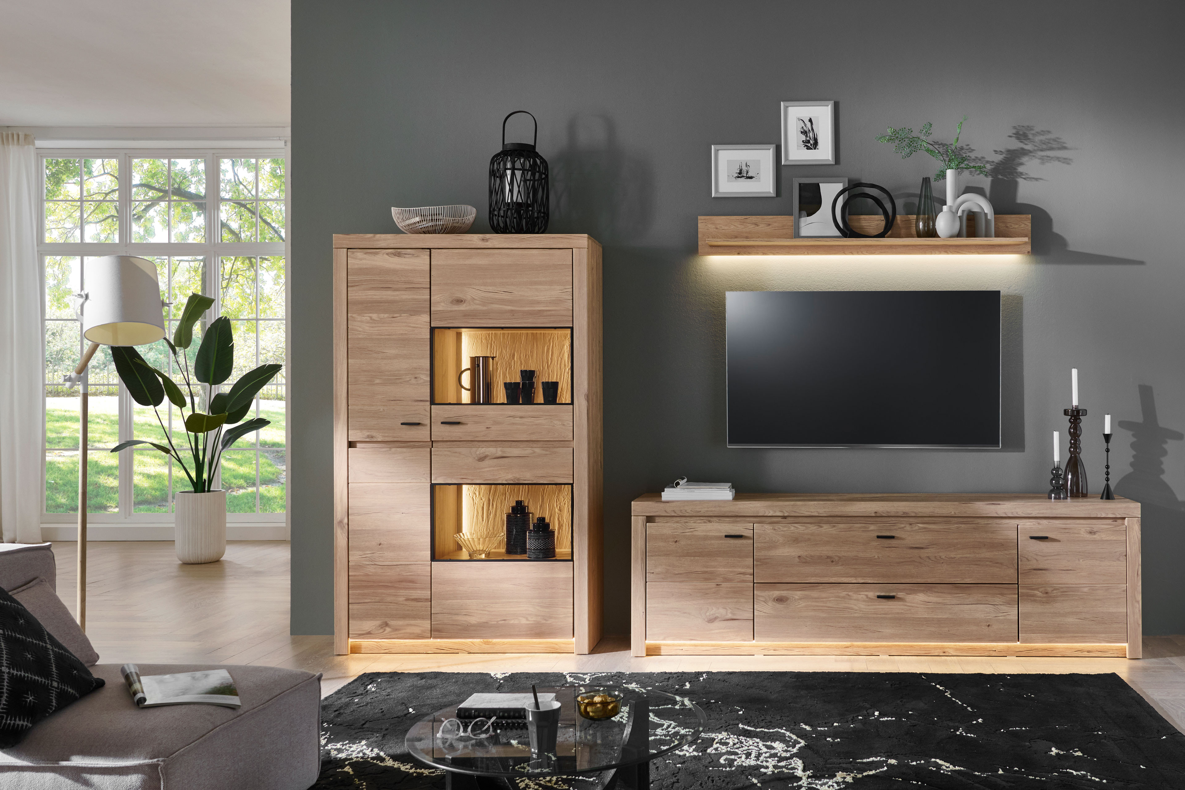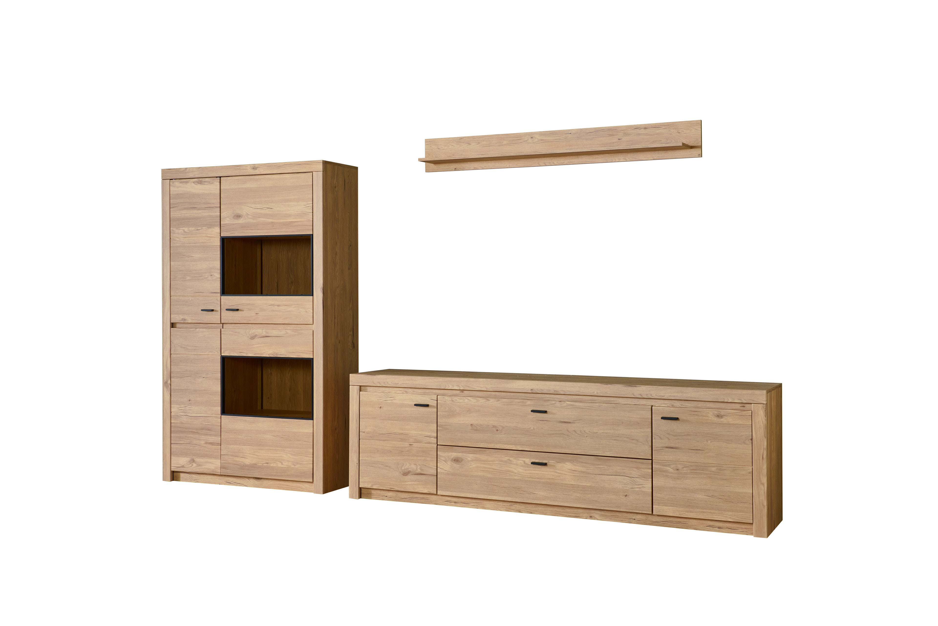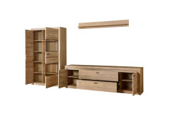 Rustikale Eiche trifft auf stimmiges Design – das ist die Kollektion Winston aus dem Hause IDEAL Möbel. Diese Wohnwand vereint die Natürlichkeit der Eiche Gustavson mit klaren Linien. Bestehend aus einem Highboard, einem Lowboard und einem Wandboard bietet das Ensemble umfassenden Stauraum sowie Präsentationsfläche für Ihre Dekorationen, Unterlagen oder all die anderen Dinge, die Sie gern griffbereit haben möchten. Das Highboard mit zwei Türen bietet in zehn Fächern viel Platz, wobei zwei dieser Böden durch die beiden Glasausschnitte in der Tür zu kleinen Bühnen für besonders schöne Stücke werden. Mit einer optionalen Fachbeleuchtung setzen Sie gekonnt Akzente und geben Ihrem Wohnraum eine gemütliche Note. Praktische, hinzubuchbare Sockelbeleuchtungen für den Hochschrank sowie das Lowboard geben Ihrem Raum eine ganz neue Ausstrahlung. Ebenso kann das Wandboard beleuchtet werden. In den Zusatzoptionen können Sie sich für das Zubehör entscheiden, das Sie möchten. Winston von IDEAL Möbel begeistert nicht nur Naturliebhaber. Lassen Sie sich überzeugen.