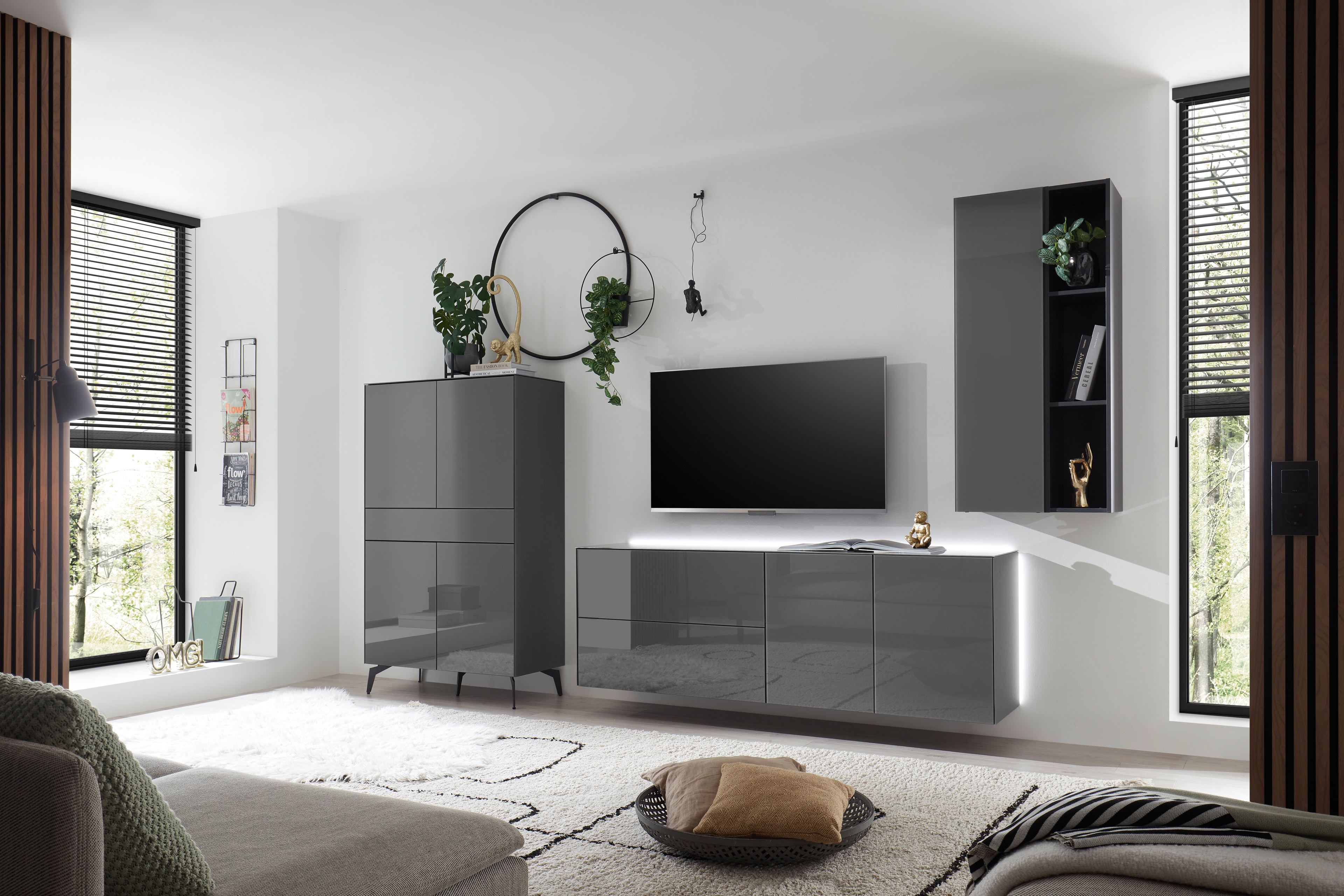 Die Wohnwand aus der Modellreihe Colors von Mäusbacher steht für zeitgemäßes Design, präzise Verarbeitung und hochwertige Materialien. Die ausdrucksstarke Kombination aus glänzendem Glas in edlem Anthrazit und graphitschwarzem Lack verleiht dem Ensemble eine starke visuelle Tiefe und eine elegante, moderne Anmutung. Das grifflose Design mit komfortabler Push-to-open-Funktion unterstreicht die klare Linienführung und sorgt für eine puristische Optik. Das TV-Unterteil ist in der hängenden Ausführung zu sehen. Mit Bodengleitern, welche im Lieferumfang enthalten sind, kann der Solist auch mit nur wenigen Handgriffen stehend genutzt werden. Weiterhin stehen Ihnen je nach persönlichem Anspruch drei verschiedene unterschiedliche Lowboardvarianten zur Auswahl. Entscheiden Sie sich für ein Möbel mit Türen auf der linken Seite, auf der rechten Seite oder mit je einer Tür auf beiden Seiten. Die Klappe sowie der Schubkasten erhalten je nach Wahl auch ihre ideale Position. Des Weiteren überzeugen das Hängeregal mit seinen drei offenen Fächern sowie der Hängeschrank mit einer Tür mit zusätzlichem Stauraum. Beide Wandelemente sind ebenfalls flexibel einsetzbar. Ob horizontale oder vertikale Montage: gestalten Sie Ihr Wohnzimmer ganz nach Ihren Vorstellungen. Darüber hinaus ist die Wohnwand von Mäusbacher in weiteren Zusammenstellungen erhältlich und lässt sich individuell an unterschiedliche Raum- und Stilkonzepte anpassen. Ein durchdachtes Möbelensemble für moderne Wohnräume mit Anspruch an Design, Funktion und Qualität.