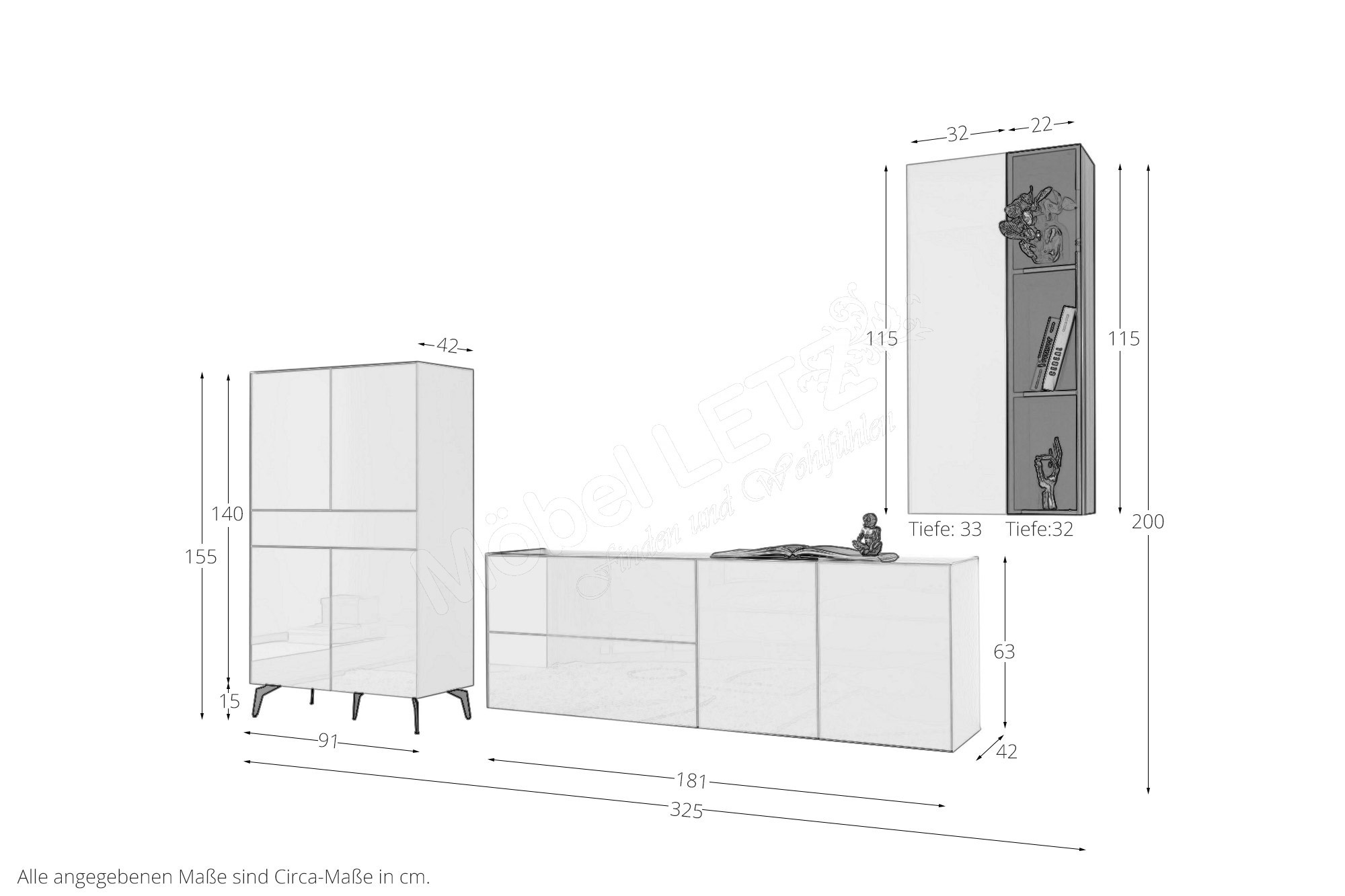 Gesamtmaße des Lowboards: BHT ca. 181/78/42 cm (Art-Nr. Metallfüße Blitz)
