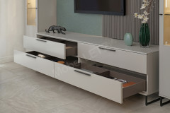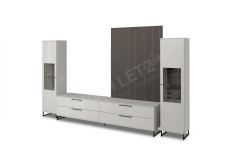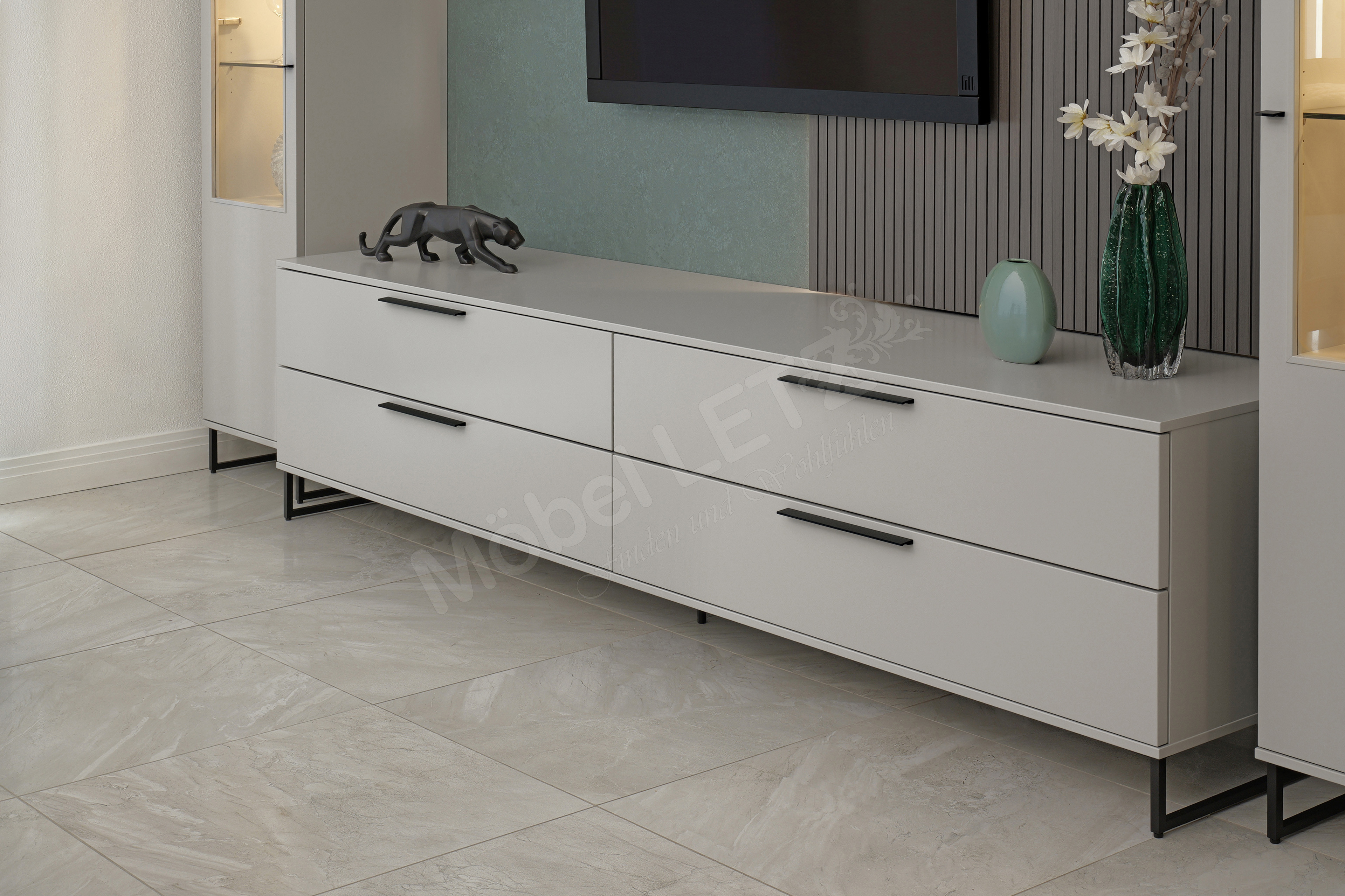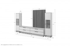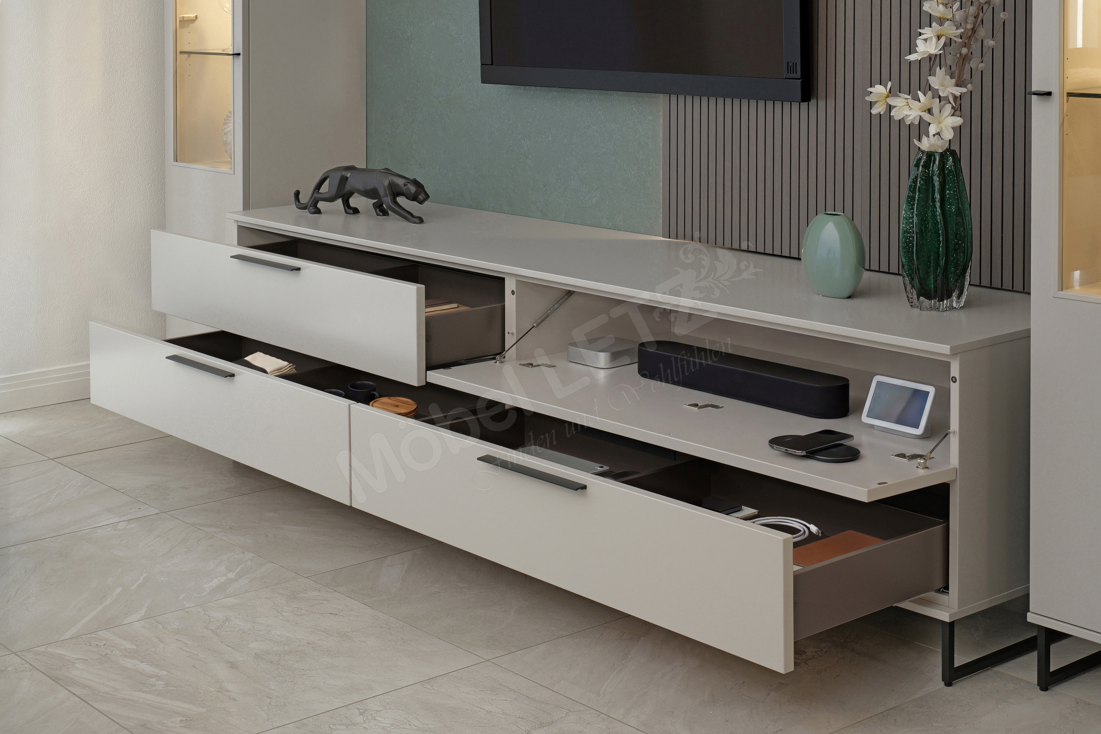 Nicht nur exklusiv, sondern ebenso zauberhaft präsentiert sich diese Wohnwand Kara-System von Musterring. Die durchdachte Kombination setzt sich aus zwei Vitrinen, einem Lowboard sowie einem ausdrucksstarken Wandpaneel mit Feinschliff zusammen und entfaltet in jedem Wohnraum ihre besondere Wirkung. Eine brillantgraue Ausführung harmoniert stilsicher mit schwarzen Metallelementen und Paneelakzenten mit Deepline, wodurch ein ruhiges, zugleich klar strukturiertes Gesamtbild entsteht, das Behaglichkeit und Modernität vereint. Die beiden Vitrinen verfügen über eine integrierte Beleuchtung, die Ihre Lieblingsstücke wirkungsvoll in Szene setzt und für eine angenehme Atmosphäre sorgt. Hinter den Türen stehen jeweils sechs Fächer zur Verfügung, zwei davon durch einen Glasboden unterteilt und durch einen Klarglasausschnitt einsehbar. Ergänzt wird das Ensemble durch die integrierte indirekte Beleuchtung des Paneels, das dem Arrangement eine stimmungsvolle Lichtkomponente verleiht und die gesamte Gestaltung sanft akzentuiert. Das Lowboard ergänzt die Kombination mit drei voll ausziehbaren Schubkästen sowie einer funktionalen Klappe für verschiedenste Utensilien. Dank Selbsteinzug und Softabstoppung schließen alle Elemente sanft und nahezu geräuschlos, sodass Komfort und Qualität spürbar werden. Mit dem Kara-System von Musterring entscheiden Sie sich für ein stilvolles Wohnkonzept, das Design, Funktionalität und eine harmonische Lichtinszenierung gekonnt miteinander verbindet.