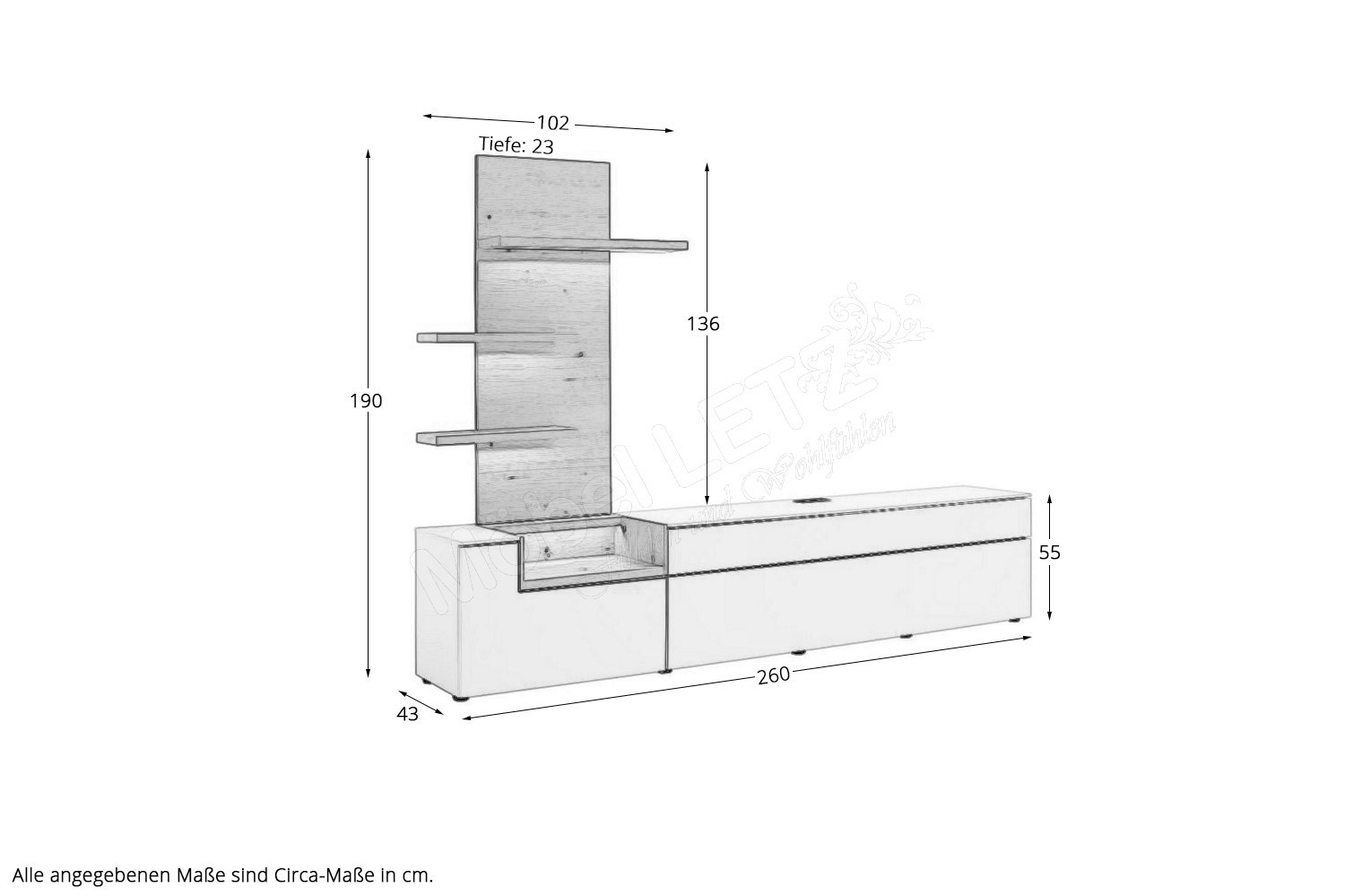 - Lowboard mit 1 Holztür, 1 verstellbaren Holzboden und 2 Schubkästen