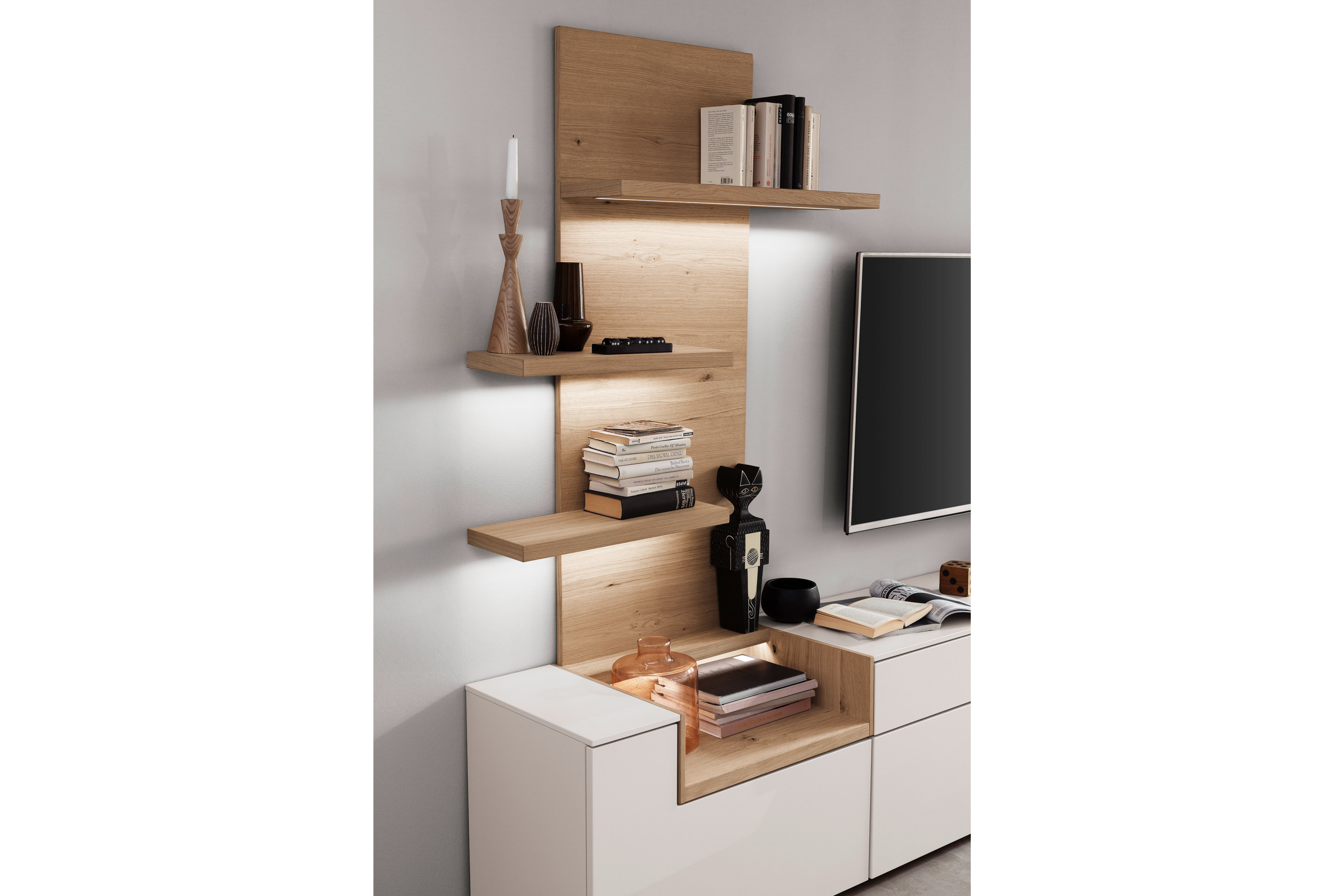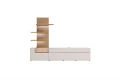 Wie ein heller Ruhepol im Raum entfaltet diese Wohnwand ihre Wirkung – klar gezeichnet, fein akzentuiert und mit einer natürlichen Wärme, die moderne Wohnräume besonders einladend macht. Die Wohnwand von SCHÖNER WOHNEN aus der Modellreihe Credenza-living vereint zeitloses Design mit einer sorgfältig abgestimmten Materialkomposition. Die klaren Flächen und die ruhige Linienführung lassen das Duo äußerst elegant erscheinen. Natürliche Holzdetails verleihen dem Ensemble eine wohnliche Tiefe. Für eine sanfte Farbgebung, die Ihrem Wohnraum eine freundliche und zugleich offene Atmosphäre schenkt, sorgt der angoraweiße Mattlack des Lowboards. Als stilvoller Kontrast setzt die Absetzung in hellem Wildeichenfurnier einen warmen und natürlichen Akzent. Die feine Struktur des Holzes bringt Bewegung in das Design und unterstreicht den hochwertigen Charakter der Möbel. Auch funktional überzeugt das Wohnset: Das TV-Unterteil bietet mit einer Holztür, einem verstellbaren Holzboden sowie zwei großzügigen Schubkästen ausreichend Stauraum für Ihre persönlichen Utensilien. Dank der integrierten Vollauszüge lassen sich die Schubkästen komfortabel öffnen. Zudem sorgen hochwertige Beschläge mit Selbsteinzug und Dämpfung für sanfte und geräuscharme Bewegungen. Die grifflos integrierte Push-to-open-Technik unterstreicht die puristische Gestaltung. Ergänzt wird das Ensemble durch ein Wandpaneel mit drei festen Holzböden, das Raum für Bücher, dekorative Objekte oder persönliche Lieblingsstücke schafft und gleichzeitig die Wandfläche stilvoll strukturiert. So entsteht ein modernes Wohnkonzept, das Leichtigkeit, Funktionalität und natürliche Eleganz harmonisch miteinander verbindet.