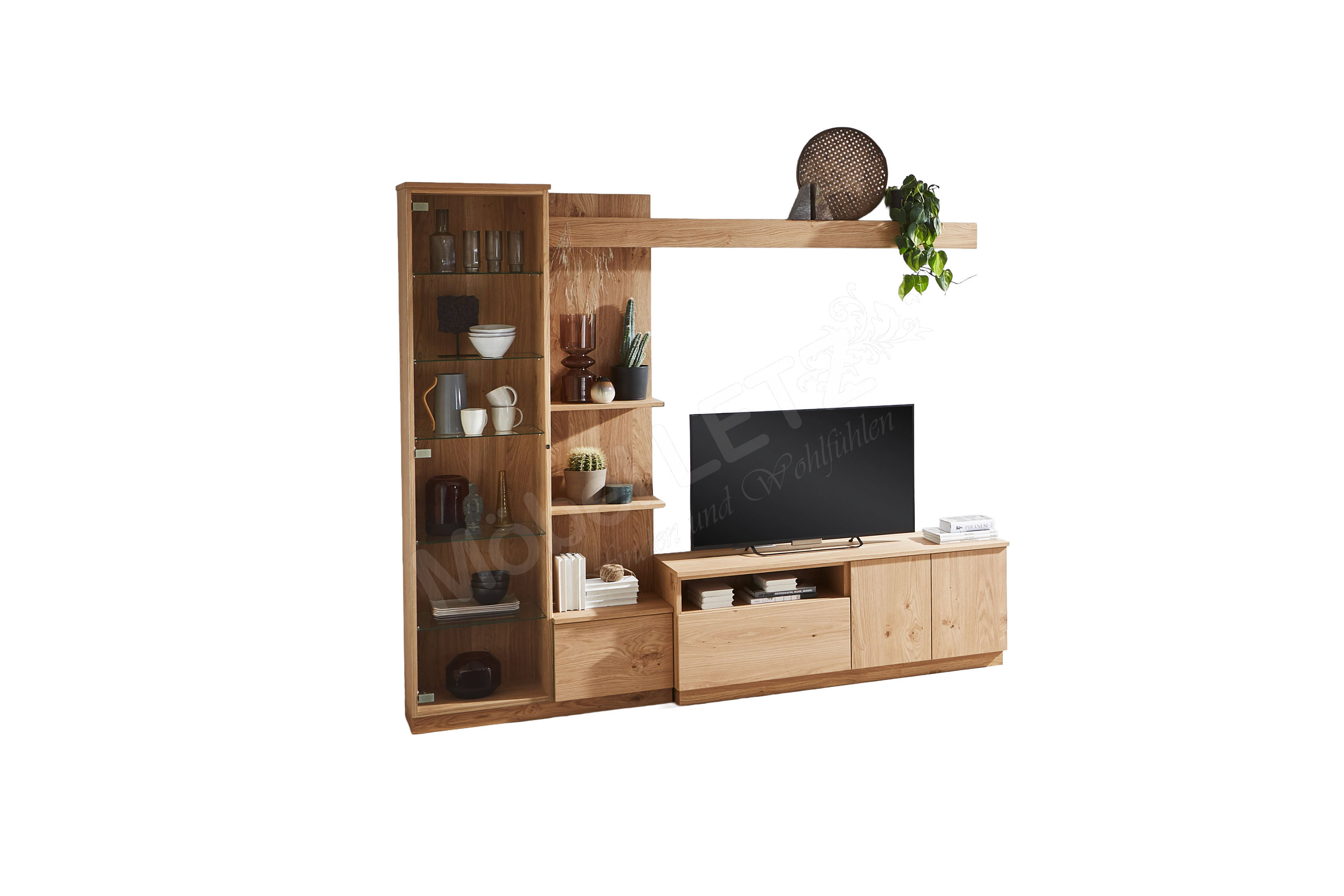 Eine Wohnwand entfaltet ihre Wirkung besonders dann, wenn sie unterschiedliche Funktionen selbstverständlich miteinander verbindet und dabei eine ruhige Gesamtlinie bewahrt. Die Kombination aus der Modellreihe Tessaro-living von Schösswender schafft genau diese Balance und wird so zum strukturierten Mittelpunkt Ihres Wohnbereichs. Das edle Wildeichenfurnier sorgt für eine natürliche Lebendigkeit, die durch die Oberfläche in Samtöl sanft betont wird. So entsteht eine warme, gleichmäßige Ausstrahlung, die dem Raum Tiefe gibt, ohne ihn zu dominieren. Die klaren Formen und fein gerundeten Kanten sorgen zusätzlich für ein harmonisches Gesamtbild. In der praktischen Nutzung zeigt sich das Wohnset vielseitig aufgestellt. Die Vitrine mit Glastür und mehreren Glasböden bietet Raum für eine dezente Präsentation Ihrer ausgewählten Lieblingstücke. Ergänzend dazu schafft das Regal mit unterschiedlich angeordneten Ablageböden und einem Schubkasten ideale Unterbringungsmöglichkeiten für Bücher oder dekorative Elemente. Das Lowboard rundet das Ensemble funktional ab und bietet mit zwei Türen, einem Schubkasten und einem offenen Fach Platz für Mediengeräte und diverse Alltagsgegenstände. So entsteht ein durchdachtes Wohnkonzept, das sich flexibel erweitern lässt und mit seiner natürlichen Ausstrahlung eine angenehme, aufgeräumte Atmosphäre schafft.