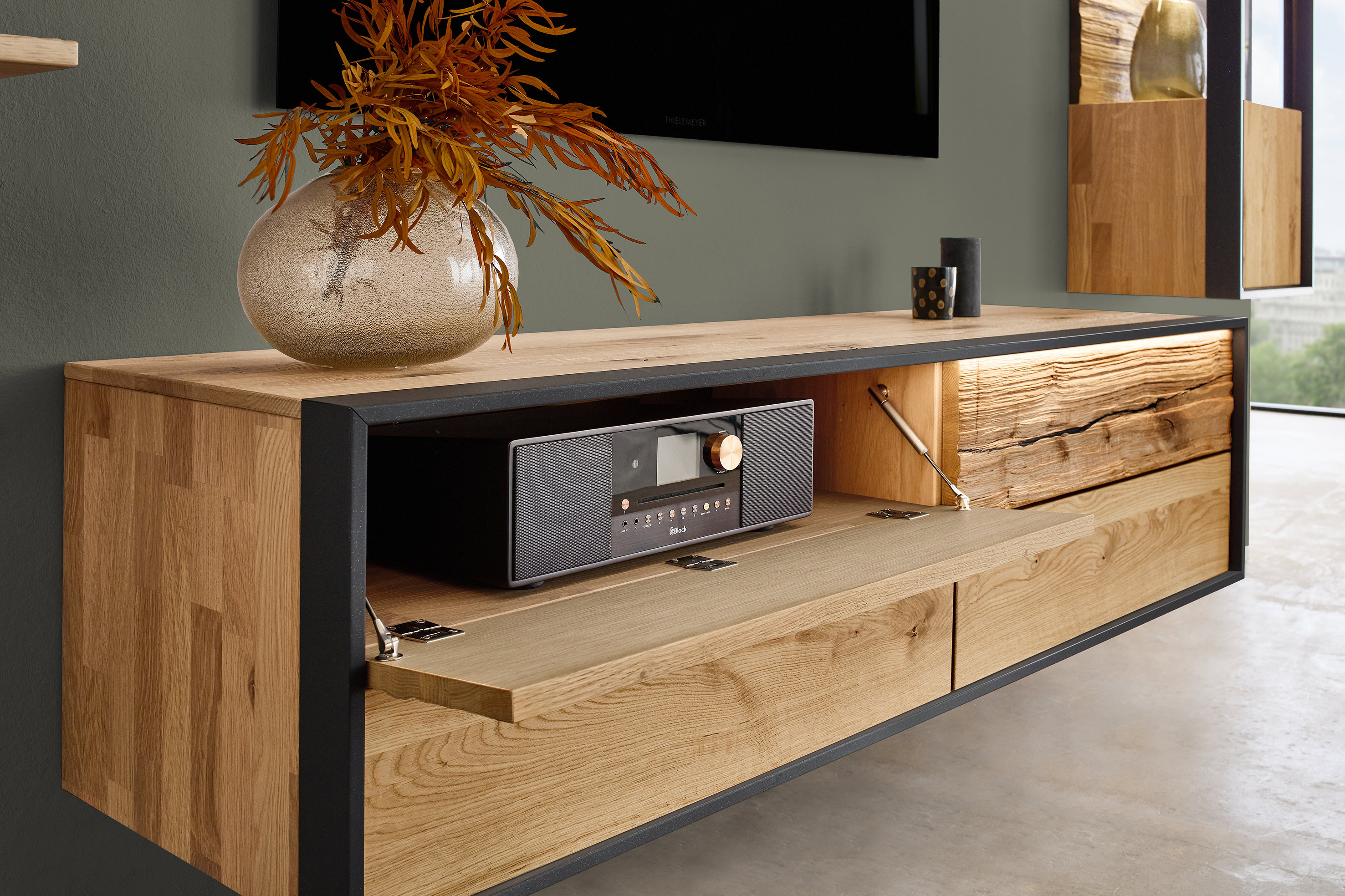 Massive Präsenz. Klare Linie. Spürbare Qualität. Das Lowboard von Thielemeyer aus der Modelrleihe Steel living verkörpert die Essenz moderner Wohnkultur in ihrer kraftvollsten Form. Gefertigt aus massiver Wildeiche und geprägt von handwerklicher Präzision, entsteht ein Möbelstück, das Ruhe ausstrahlt und zugleich eine markante Wirkung entfaltet. Hier trifft gewachsene Natürlichkeit auf zeitgemäße Reduktion – ganz im Sinne von „Tradition und Fortschritt“. Der Korpus aus gebürsteter Wildeiche verleiht dem Möbel strukturelle Stabilität. Fronten, Oberboden und die unteren Schubkästen sind ebenfalls aus massiver Wildeiche und mit durchgehenden Lamellen gefertigt – ein Detail, das die horizontale Linienführung betont und die natürliche Maserung eindrucksvoll zur Geltung bringt. Einen spannenden Kontrast setzt die Absetzung der oberen Klappen aus charaktervollem Spaltholz, das mit seiner lebendigen Oberfläche Authentizität und Individualität in den Raum bringt. Die 2 Klappen und zwei Schubkästen bieten sowohl großzügigen als auch komfortablen Stauraum. Dank Vollauszug und gedämpftem Selbsteinzug gleiten sie sanft und geräuschlos. Die grifflos gestaltete Push-to-open-Technik unterstreicht die puristische Formensprache und sorgt für eine makellos ruhige Front. Hochwertige Metallbeschläge mit Automatik-Schnellmontage stehen für langlebige Funktionalität. In Kombination mit weiteren Möbeln von Thielemeyer entsteht ein luxuriöses Wohnkonzept, das Massivität, Handwerkskunst und moderne Klarheit harmonisch verbindet.