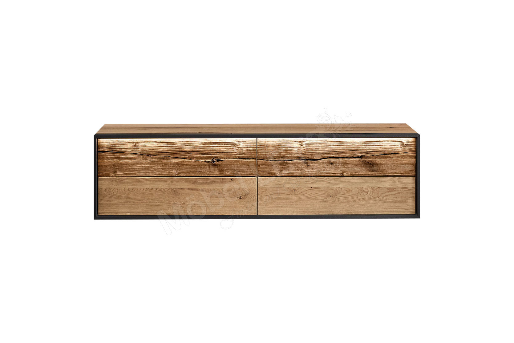 - Front/ Oberboden/ Schubkästen (unten): Wildeiche, massiv, gebürstet, mit durchgehenden Lamellen