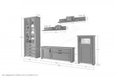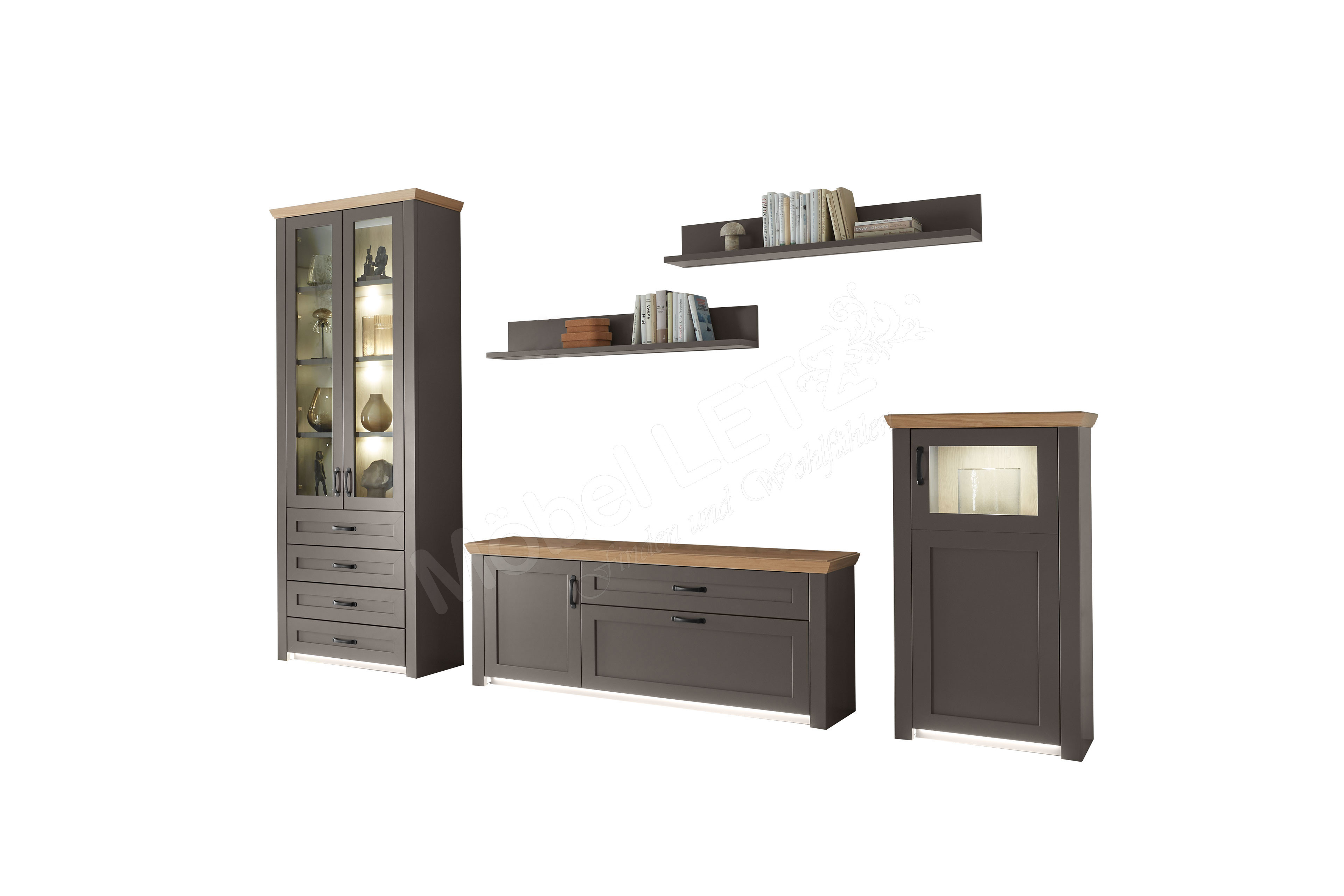 Umfangreichen Stauraum mit dem unvergleichlichen Charme des Landhausstils bekommen Sie mit dieser Wohnwand von Wehrsdorfer Werkstätten aus dem Modell Move-living. Die Kombination aus einer Vitrine mit Schubkästen, einem Lowboard, einem schmalen Highboard und zwei Wandregalen ist in einem graphitfarbenen Lack gehalten, während die Akzente in Asteiche für einen warmen Kontrast sorgen. Zwei weitere Lacke bieten Ihnen die Möglichkeit, dieses Ensemble nach Ihren Wünschen zu gestalten und viele weitere Extras finden Sie in den Zusatzoptionen. Darf es etwas Licht sein? Mit passenden Sockelbeleuchtungen zu allen Kastenmöbeln kreieren Sie ein gemütliches Ambiente, während LED-Spots für das gewisse Highlight sorgen. Für das Lowboard stehen Ihnen diverse Ablagemulden zur Auswahl, um beispielsweise die Fernbedienung oder Batterien sicher ablegen zu können. Für noch weitere Individualisierungen können Sie gern unser geschultes Fachpersonal kontaktieren, welches Ihnen bei der Zusammenstellung Ihrer perfekten Wohnwand behilflich sein werden. Noch mehr Inspiration finden Sie mit einem Blick in den hinterlegten Typenplan von Move-living. Wehrsdorfer Werkstätten – und Wohnen wird schöner.