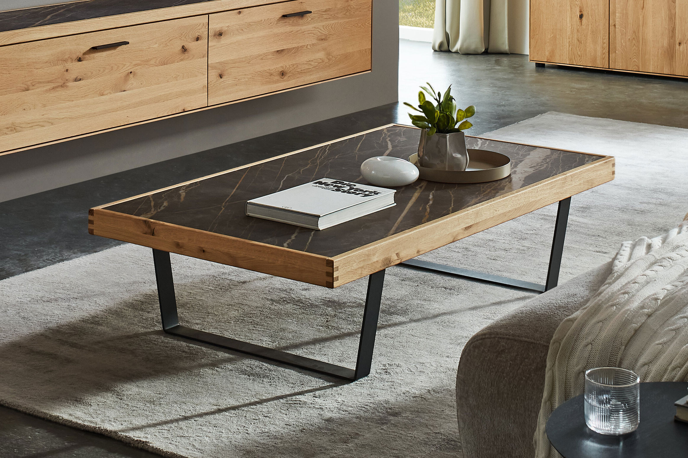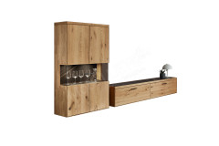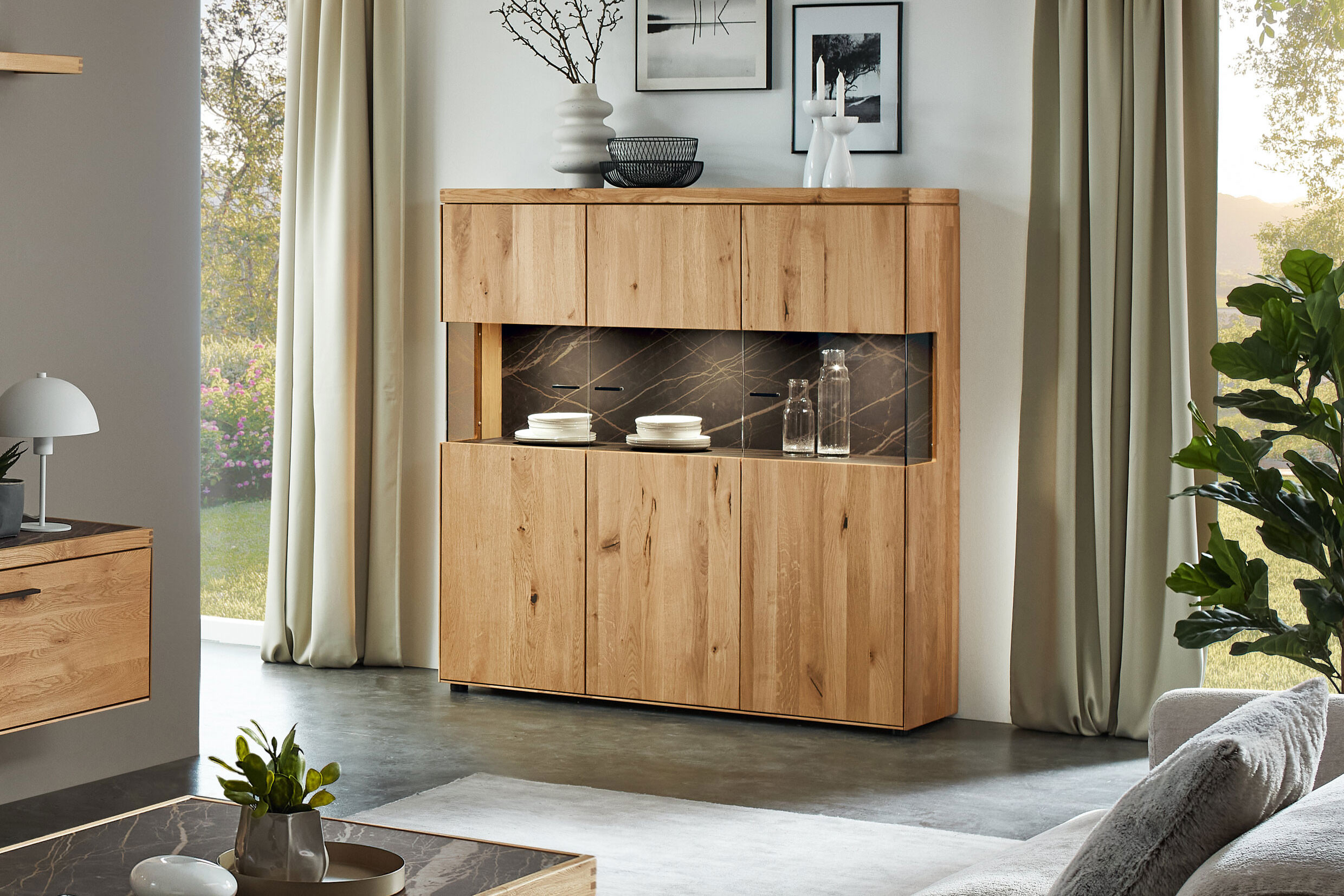 Manchmal reichen schon wenige eindrucksvolle Möbel, um ein völlig neues Lebensgefühl in Ihre vier Wände zu bringen. Diese Wohnkombination WM 2520 aus dem Hause Wöstmann wird aus massiver Wildeiche gefertigt, welche soft gebürstet sowie mit einem Natur-Effekt-Lack versehen wurde, um die Natürlichkeit des Holzes zu erhalten. Eine großzügige Hängevitrine dominiert dieses Ensemble, ohne selbst erdrückend zu wirken. Mit zwei subtilen Glasausschnitten präsentiert dieses Element Ihre Fotos und Schätze, während es gleichzeitig alles hinter den geschlossenen Bereichen gekonnt schützt. Dieser beeindruckende Solist wird mit einem Hängelowboard ergänzt, welches nicht nur zwei Klappen mit großzügigem Stauraum bietet, sondern auch ein Keramik-Abdeckblatt in Rock mit schwarz-goldenen Akzenten. Bevorzugen Sie eher die reine Holzausführung? In den Zusatzoptionen finden Sie die Möglichkeit, das Abdeckblatt abzuwählen. Möchten Sie allerdings noch weitere Keramik-Highlights hinzufügen, finden Sie auch dies an dieser Stelle. Die Hängevitrine kann mit diesem ausdrucksstarken Material optional versehen werden. Entdecken Sie die Welt der natürlichen Materialien Massivholz und Keramik – mit WM 2520 von Wöstmann.