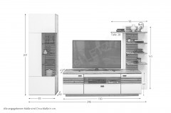 Hier präsentieren wir Ihnen eine außergewöhnliche Kombination von Wohnconcept, bestehend aus einer Standvitrine, einem TV-Unterteil und einem exquisiten Wandpaneel mit vier Ablageböden, welche Ihr Wohnzimmer in die Sphären des raffinierten Geschmacks und der funktionalen Eleganz hebt. Die Standvitrine ist nicht nur ein Aufbewahrungswunder, sondern auch ein Kunstwerk des Designs. Ihr Stauraum, wahlweise verdeckt oder dekorativ präsentiert, bietet Ihnen die Freiheit, Ihre wertvollen Schätze oder dekorativen Elemente nach Belieben auszustellen oder zu schützen. Der Schubkasten mit Dämpfung sorgen für ein leises und sanftes Öffnen und Schließen, was Ihre Sinne verwöhnt und die Liebe zum Detail unterstreicht. Setzen Sie mit der optional buchbaren Beleuchtung die Akzentrückwand der Standvitrine und des Paneels wundervoll in Szene und erhalten eine stimmungsvolle Ausstrahlung in Ihrem Wohnzimmer. Sie können das Licht an Stimmung und Bedarf anpassen, um die gewünschte Atmosphäre zu schaffen. Des Weiteren ist das TV-Unterteil nicht nur funktional, sondern auch ästhetisch ansprechend. Hier finden Ihre Multimedia-Geräte einen stilvollen Platz, und der Stauraum bietet ausreichend Platz, um Kabel und Zubehör ordentlich zu verstauen. Mit dieser Kombination bewirken Sie nicht nur eine visuelle Faszination, sondern auch eine praktische Lösung für die Organisation Ihres Wohnraums. Fresno – ein Modell aus der Wohnconcept-Kollektion.